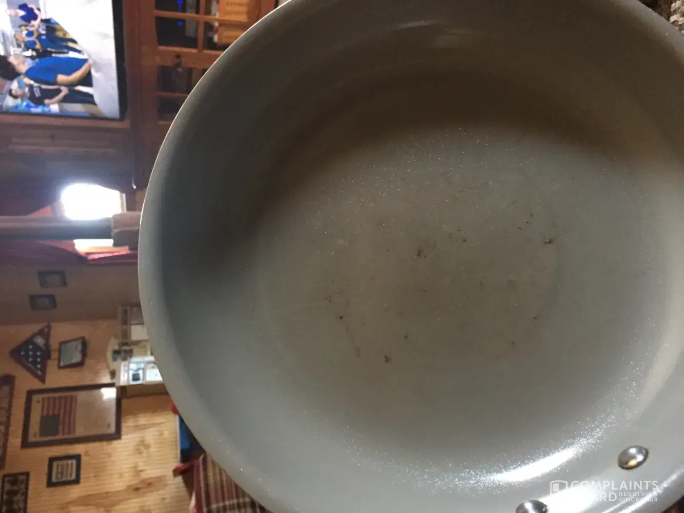 I received a food network pot set for a present. I loved them until the frying pan has a circle in middle that sticks and the small pot that I use every day for hot cereal has chips all around. I use wooden spoon all the time. The rest of the pots are wonderful but these two that I use constantly are messed up.