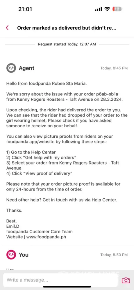 Started another chat with foodpanda agent. Gave picture proof and explanation again.