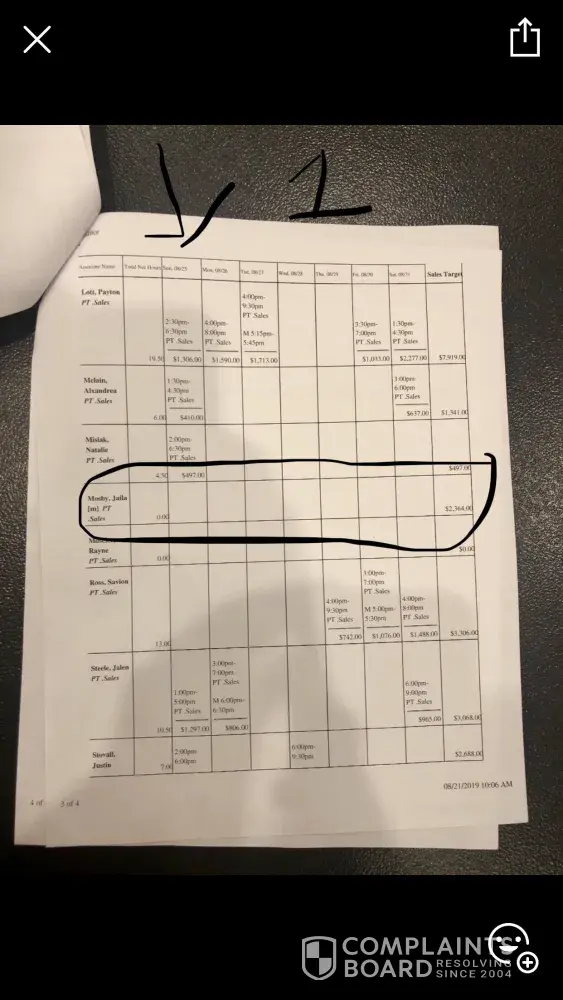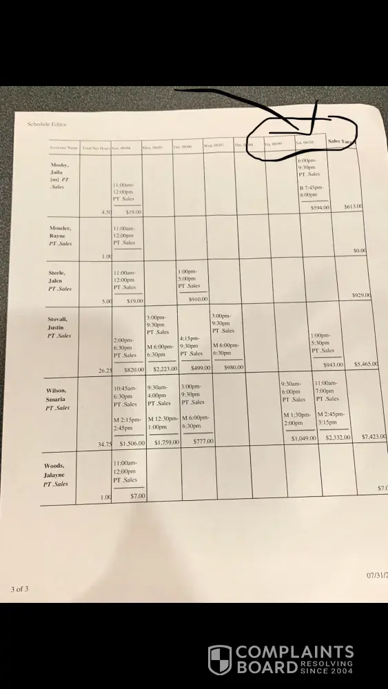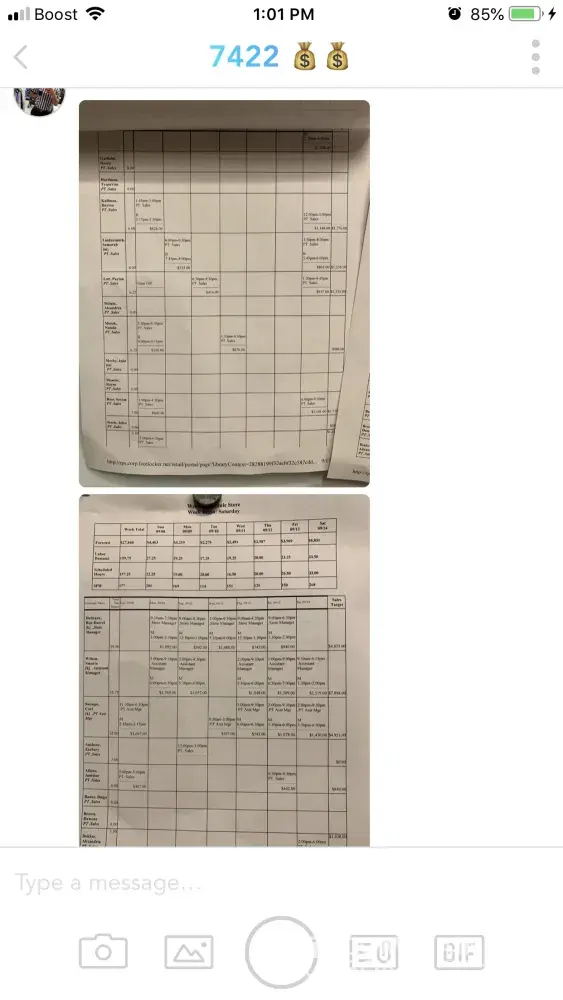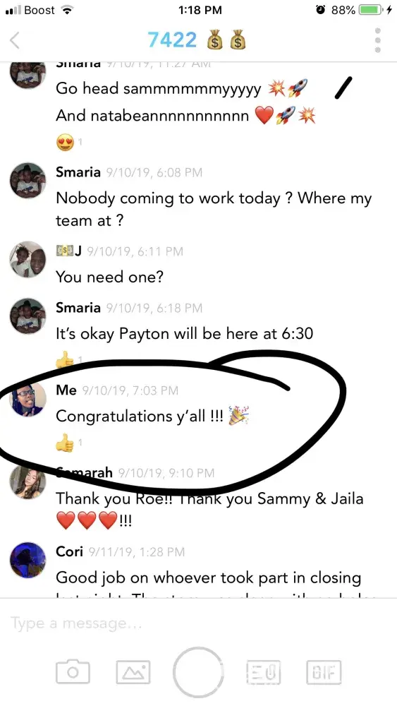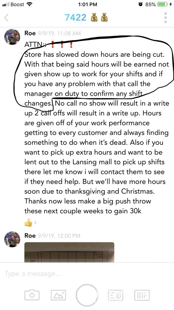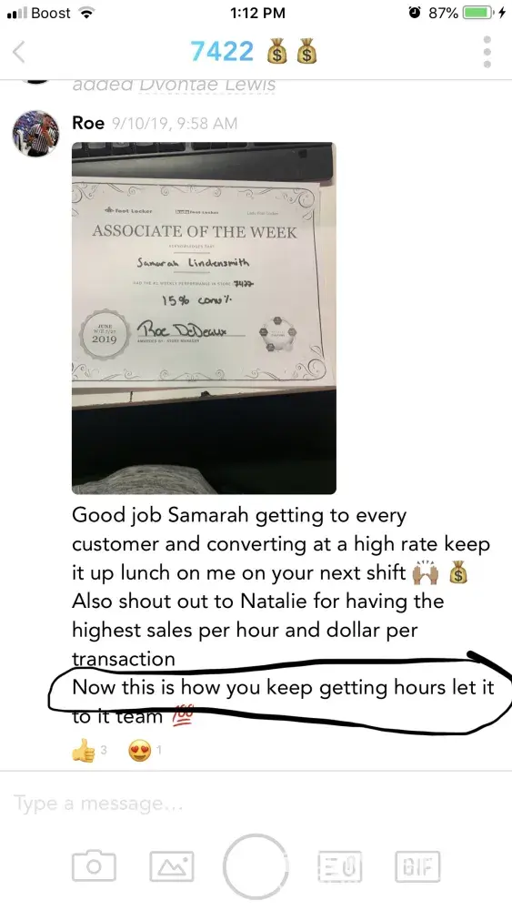 So shortly after the conversation he later sent a message in the Bubble And he sent next week schedule as well 09/09/19 -09/14/19 which I still wasn't on even after we had the conversation the previous day. He was very unprofessional and took the conversation we had to send a message that was for everyone but in direct towards me because everything he discussed in that message we talked about over the phone. An he Mention to Call the manager is on duty during that particular day I called Roe but he wasn't "on duty" but he fail to realize is that I actually did call the manager on duty(Corey ) who didn't have explanations as to why and told me to contact Roe. I didn't appreciate he was questioning my work ethic but yet couldn't tell me what I did wrong or he acknowledge the fact that I do make sales whenever I do work. So the week of 09/15/19-09/21/19 I still wasn't on the schedule so at this point I was over it. The district manager was on vacation and I honestly didn't want to contact him because I feel as though if he getting away with the scheduling and using my discount I'll rather find someone higher than the district manager. I also preferred to keep it to myself because I didn't want to make anyone aware of it and then Roe the manager find out I knew I would get Harassed even more. My time there I feel as though he make acceptions for certain employees, allow some to do what he normally wouldn't approve of. He then sent another message congratulating a sales associate not to mention he was supposed to have sales associate of the week the following day we had the meeting Sunday July 21, so why start now 4 weeks later. in my opinion he still was trying to be petty he also added another comment that I knew was directed towards me at the end of that message. It said " Now this is how you keep get hour".I felt as though he expects me to be Mad or my feelings but I congratulated them as usual.