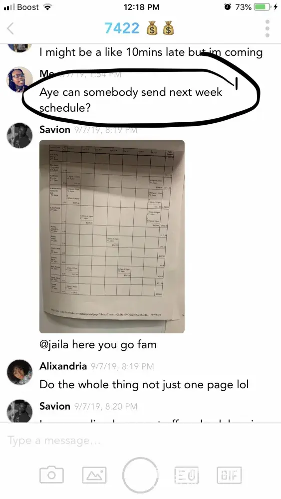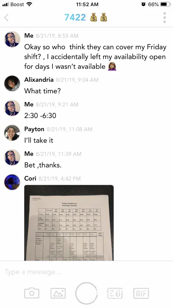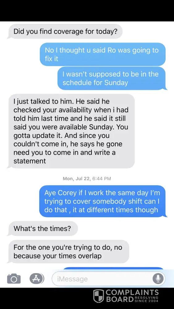 Another situation happen I kept updating my availability but was still being scheduled for days I was available, I had to to have somebody cover my Tuesday shift 08/20/19 and Friday shift 08/23/19 within that week I didn't work Sunday to that . After that happens, I don't know if the manager Roe just assumes I wasn't trying to work, but after that Week 08/18/19-08/24/19 the following week on 08/25/19 I wasn't one the schedule. Homeview stop working so I had to come in and update my availability that way, we figured out what the misunderstanding was I entered the days in wrong. He ensured me the following week I will be on the schedule. So I ask for it to be sent in the group chat called bubble, but I still wasn't on it the week of 09/01/19-09/07/19. The next week 09/15/19-09/21/19