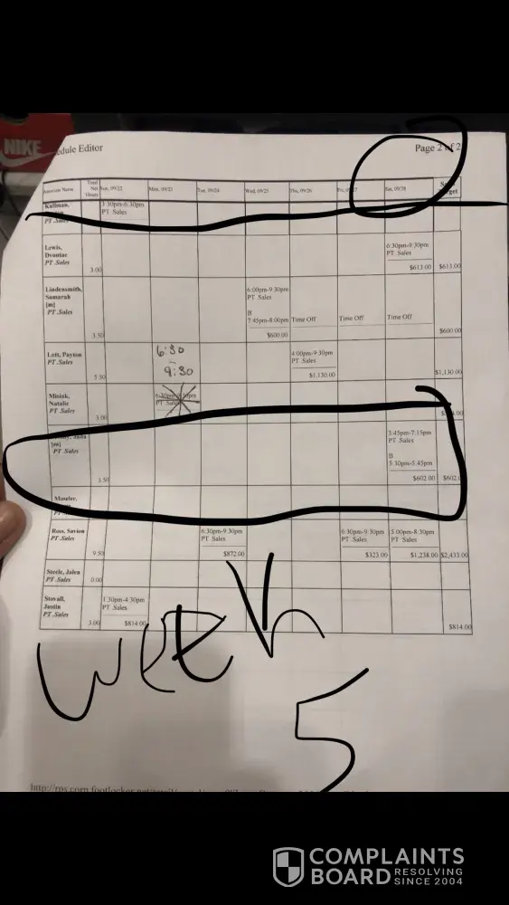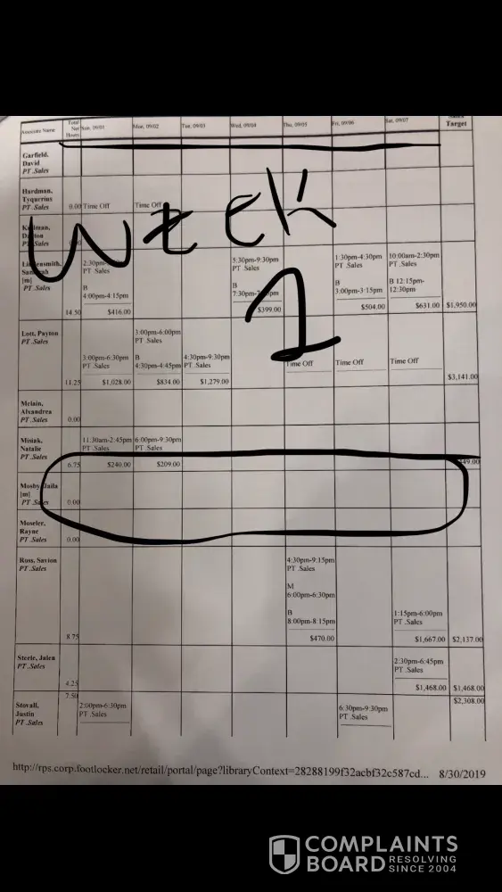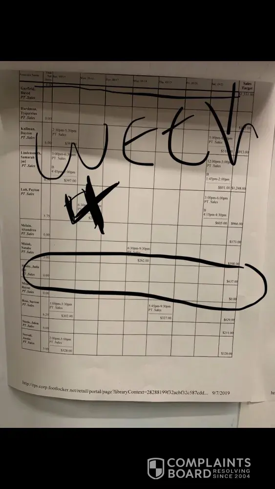So the schedule for 09/22/19 was sent I was on the schedule after 4 weeks of being off and only had 3 hours. He me on for a Saturday 3:45-7:15 if I was off the schedule for so long I feel as though I should be given a decent about of hours. I took his word when he said it was slow, but now looking back on it, it was back to school time around the weeks I wasn't schedule. I have been working for foot locker for 1 year now and the things I have experience here honestly are too overwhelming. So it is now 1:27pm, shift starts in about two hours and I will not be continuing to work at a job with such unfair treatment. When leaving a job I i. I Normally give a two week notice, but I don't want to have to see this individual again not be around someone who doesn't respect me as a person. Like logically thinking I haven't been to work for weeks now. The week you decide to put me on the schedule it's on a Saturday one of the busiest days we have during the week. In away I feel as though it was done on purpose so by the time I clock in and get to work I wouldn't know what new Releases. And in some cases the store gets rearranged so at times the back might not be the same from when you worked the previous time. I would like for this situation to be handled accordingly . I don't want to be one of the issues you all brushed off, that's part of the reason I didn't go to the district manager. I understand he's been a manager for years but he's so comfortable to the point where he feels that he can treat people any kind of way which is Sicking. He has several minors that work in his store which is one of the reasons I decided to file my complaint. Roe does questionable things that are inappropriate and work environment. I am a minor as well as a few other of the associates, but I want to speak up because I don't appreciate being dog out and disrespected by someone who is of age and should know better. I hope you are hello to situation accordingly, before I have to. I also like to say that I enjoyed my time at foot locker before this experience and would love for you to have better people in charge.