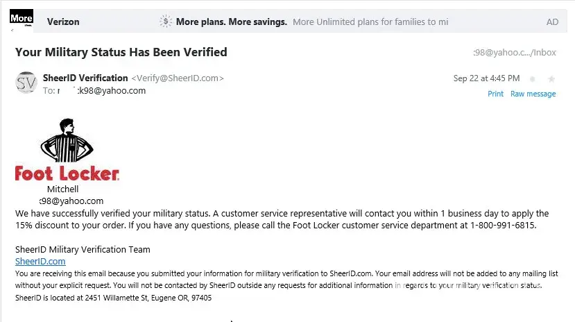 Order placed 9/22/19 online; rec'd email back same day from SheerID that my info was successful and a rep would call 1 business day to apply my 15% - as of 10/11/19 no call & customer service 800.991.6815 refuses to refund my 15%. Advised I need to contact SheerID. No I should not have to do their work when I have an email advising it was successful. They wanted me to provide info over phone again advised I would not as I have already uploaded info requested and was advised it was successful. They put me on hold FOREVER when asked for manager; Angel the supposed manager gave me the same runaround.