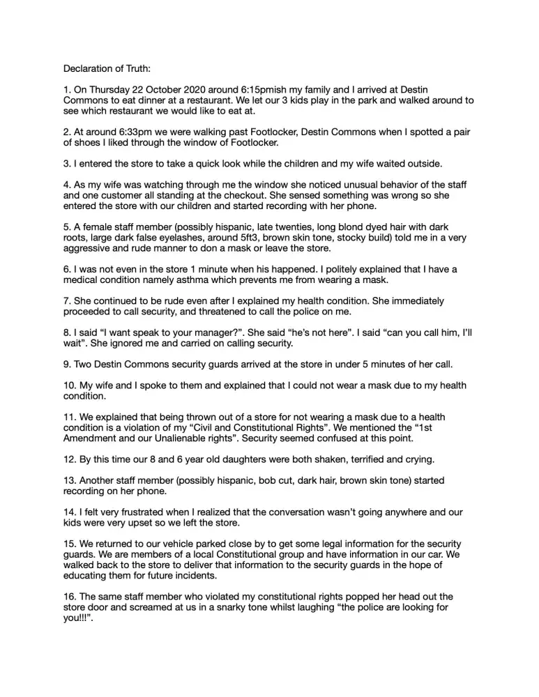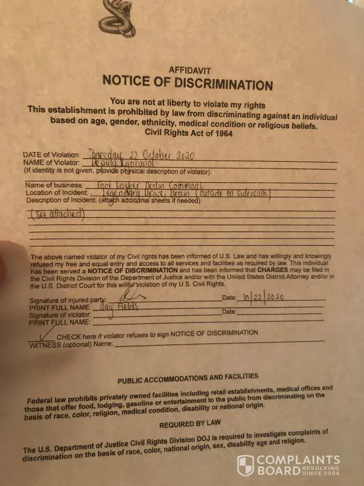 On Thursday 22 October 2020. Foolocker staff member aggressively asked me to leave the store for not wearing a mask. I explained that I cannot due to my health condition . Footlocker is defined legally as a "public accommodation" and have willingly and knowingly denied my rights under: *US Constitution, 1st Amendment *Deprivation of Rights Under the Color...