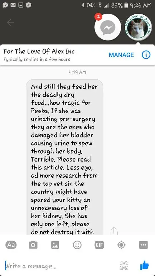 About a day or two after her second surgery to remove the leaking kidney, I had posted an update to her donors and our friends discussing what had happened with our cats surgery, etc. For the Love of Alex proceeded to message me on FB bashing us for feeding our cat dry food, yet again. She also bashed our doctors and mentioned that our "ego" was getting in the way of our cats care. She did not offer us ANY help, just hurtful words and wasted time. I am so angry, because this woman should not be a 501c3 and I plan to take action against her. If you are reading this, I beg you to do the same. I have never in my life met anyone as cruel as her.