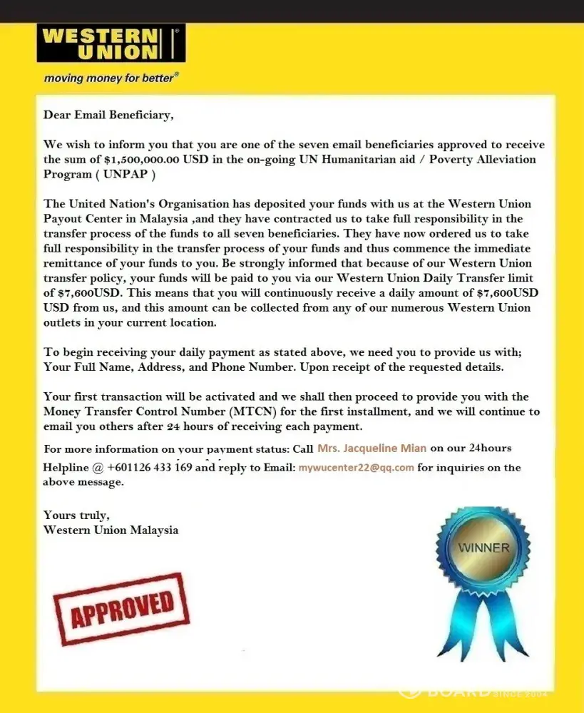 WESTERN UNION MONEY TRANSFER MALAYSIAN PAY-OUT CENTER Dear Western Union Beneficiary, Transaction #: WUMT-MY7910****/2013 ( Your Security Code ) UNITED NATIONS PAYMENT NOTIFICATION. We wish to inform you that the United Nations (UN) has authorized us to remit to you a total amount of $1, 500, 000.00 USD (One Million Five Hundred Thousand United States Dollars). This amount is to be paid to you because of the fact that you were selected as a beneficiary in the Last E-mail ballot promotion Held in Malaysia, by United Nations Poverty Alleviation Program. This Program is inline with the Social responsibility of the United Nations Organization, which is held once Every year to change the living status of five (5) lives around the Globe. This year, yourself and Four (4) other people were randomly selected. On behalf of the United Nations Organization, we wish to congratulate you formally. The funds was paid out to us, by the United Nations, And they have successfully succeeded in depositing your whole funds with us Here at Western Union Malaysia. They have now ordered us to take full Responsibility in the transfer process of your funds and thus commence the Immediate remittance of your funds to you. Be strongly informed that because Of our Western Union transfer policy, your funds will be paid to you via our Western Union Daily Transfer limit of $7, 600.00 USD. This means that you will Continuously receive a daily amount of $7, 600.00 USD from us, and this amount Can be collected from any of our numerous Western Union outlets in your Current location. To begin receiving your daily payment as stated above, we need you to provide Us with; Your Full Name, Address, and Phone Number. Upon receipt of the Requested details, your first transaction will be activated by you, before we can proceed to provide you with the Money Transfer Control others after 24 hours of Receiving each payment. For more information on your payment status; E-mail Mrs. Franca Lee: accpayout@mail.mn OR call our 24 hours Helpline @ +[protected] or [protected] for any inquiries on the above message. Yours truly, Miss. Jeannette Anna Nielsen. For: United Nations/Western Union, Malaysia.