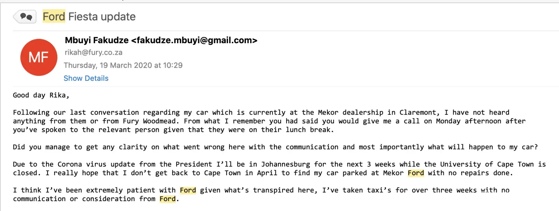 I then flew up to Johannesburg and managed to see Rika at Fury Woodmead (on either Monday the 16th or Tuesday the 17th of March 2020) I can't remember the exact date but it was one of those two days given that I was supposed to fly back to Cape Town on Monday the 16th. While I was in her office, she tried to contact Mekor Ford and she couldn't get through to the right person after being told that they were on lunch, she too became frustrated with them and asked to speak to a service manager to escalate the poor service and complacency. She told me that she'll investigate it and get back to me as soon as she's spoken to the manager.