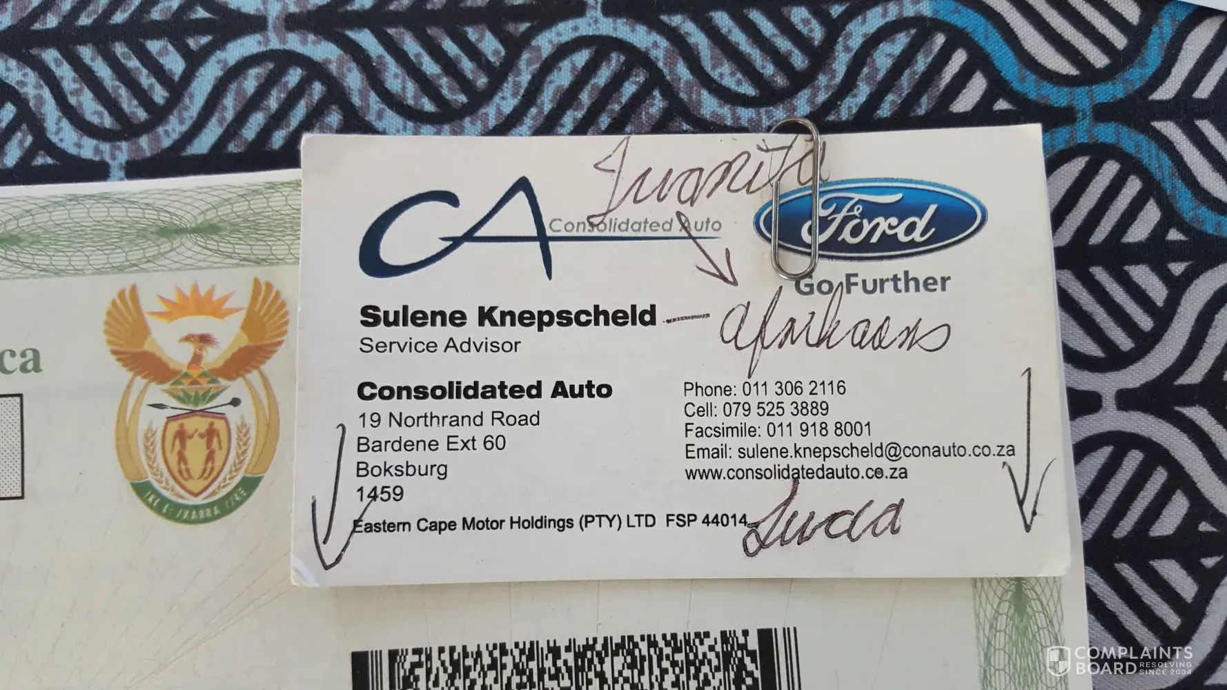I then tried to contact the service advisor that I use to book and facilitate my car's services and repairs through at Fury Woodmead (her name is Palesa). After struggling to get through to the switchboard and Palesa, I managed to call the car salesman who sold me the car at the same dealership in 2016 (Farai Mahara - [protected]); I informed him about what had happened to both the engine and the brakes and how my life had been put in danger on two occasions now by this faulty car. He referred me to the head of the service department - Rika Howland [protected]), email: [protected]@fury.co.za