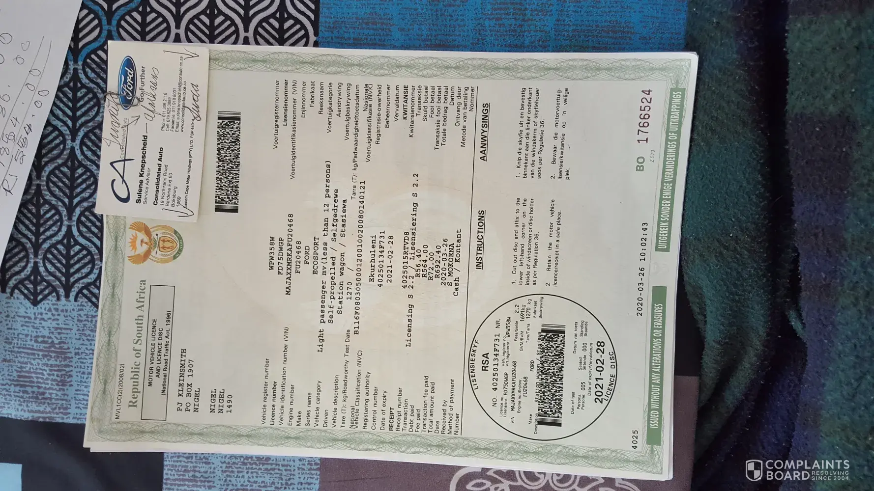 The next correspondence I received was a text from Mekor Ford thanking me for my support on the 4th of March 2020 at 10:06.