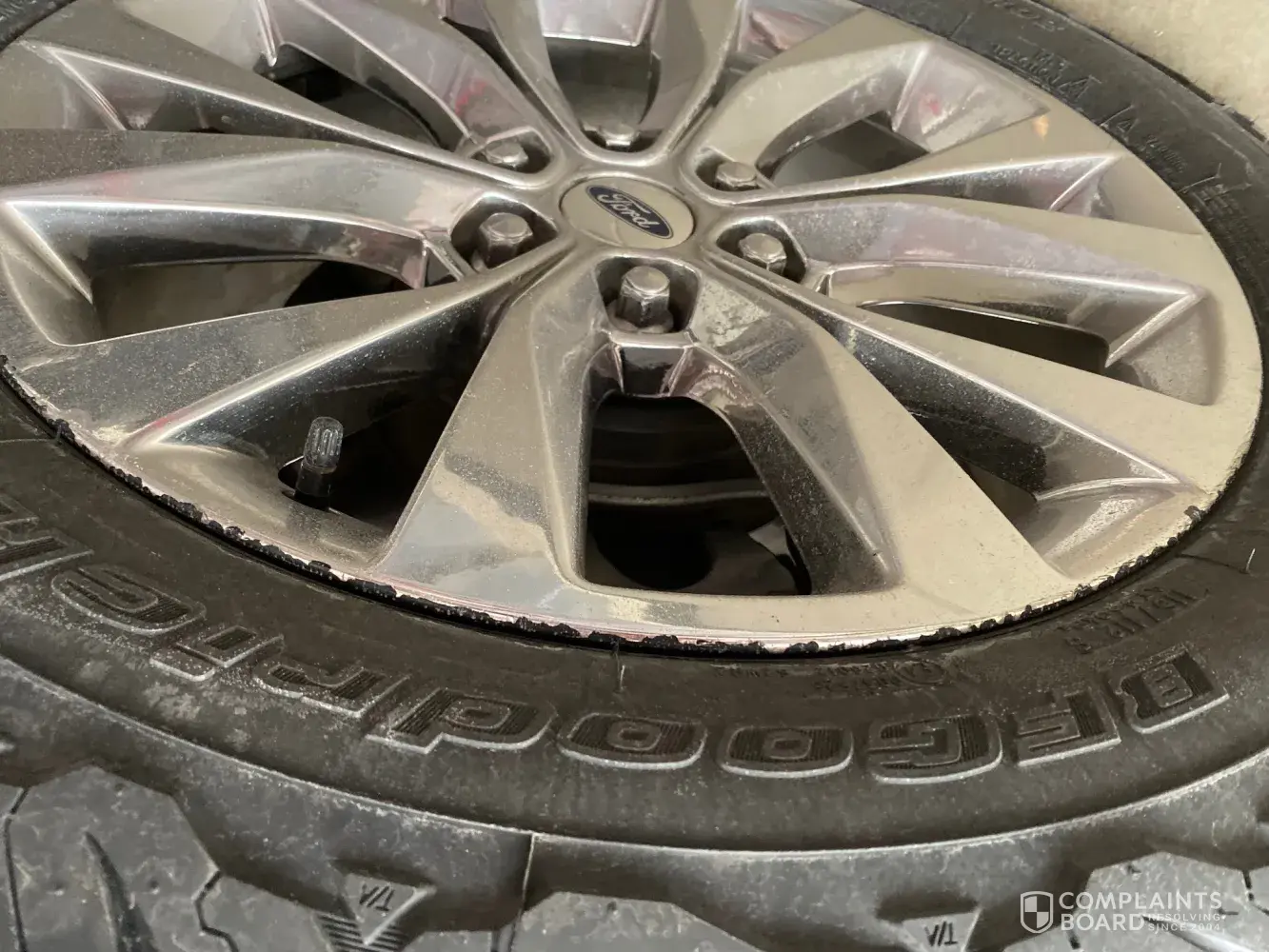 I've attached photos of the F150, the undamaged rim when we purchased the vehicle, and examples of the peeling when we had the tires replaced.