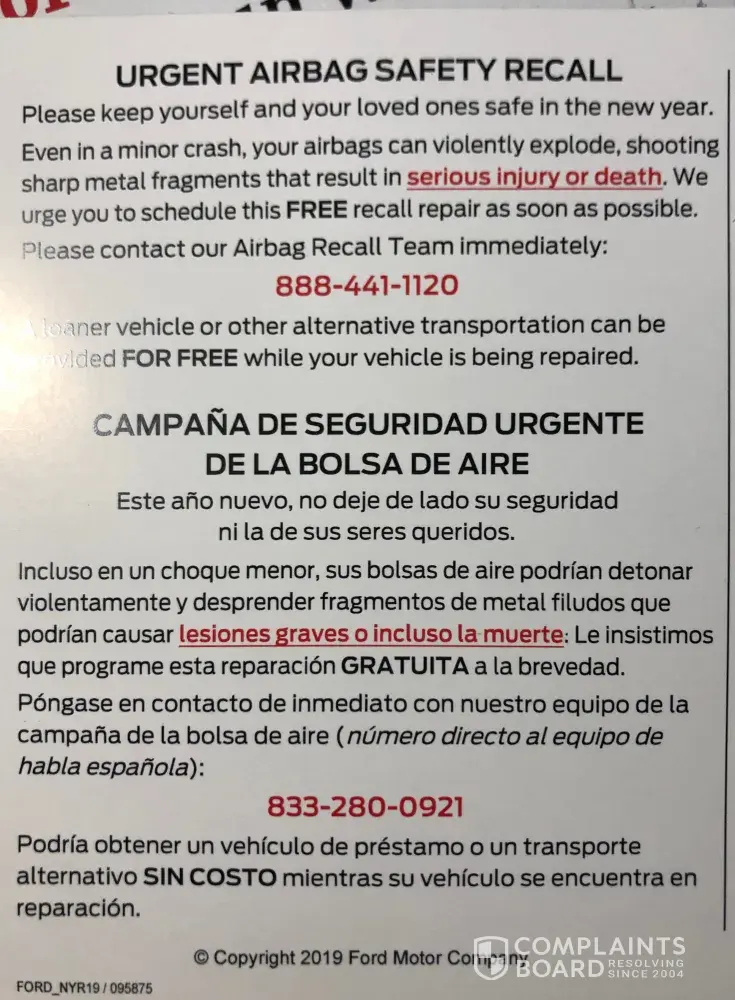 ford ranger airbag recall since 2016!