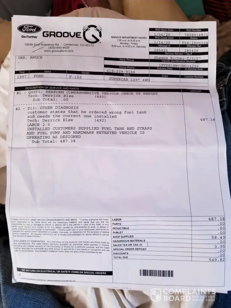 My wife travel to Texas after Groove Ford of Denver had installed the gas tank, on our truck. Unfortunately gas was observed leaking when the truck was filled up with gas in Fredericksburg Texas. The local Ford dealership (see the attached file) identified the problem with the bolts securing the fuel sender bolts being loose. This email is requesting That groove Ford pay for the faulty work done in the amount of $121.32 and the unscheduled stay over at the hotel of $131.65 for a total amount of $252.97