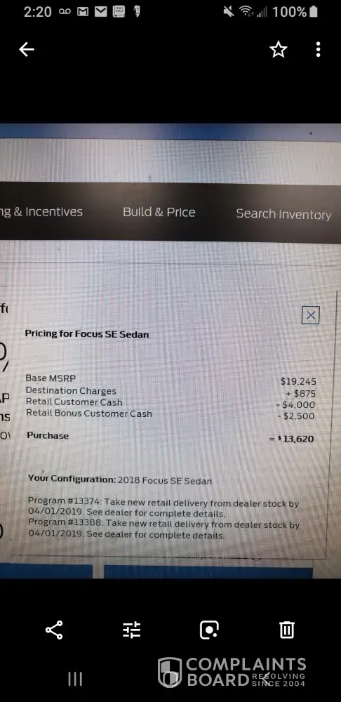 Went to Ford.com on Friday March 1, 2019. Listed in 2018 Focus Se sedan, with zip code 53126, rebates of - retail customer cash $4, 000.00 and retail bonus customer cash $2, 500.00. On the bottom of advertised rebates stated; program 13374 take delivery from dealer stock by 04/01/2019. program 13388 take delivery from dealer stock by 04/01/2019. I attempted to contact Ford Corp customer service and was informed that I was speaking with marketing. I explained the specific rebates that were only listed on Ford. Com on March 1, 2019 were no longer listed as those amounts. Ford.com website now lists the rebates as $3500 and $1500. I was informed that Marketing division could not assist me and they were unaware of what was listed on the website. I informed Uptown Ford Kelsey Meyer (Wauwatosa, WI, ) of the rebates, and I emailed a screenshot of the Ford.com rebates. I informed Kelsey that her sales manager may be able to get ahold of someone who would assist me with the rebates of $4000 / $2500. I've attempted to file a BBB complaint, but was not contacted by the BBB for anything further than the initial complaint. I still have a screenshot of the rebates in question.