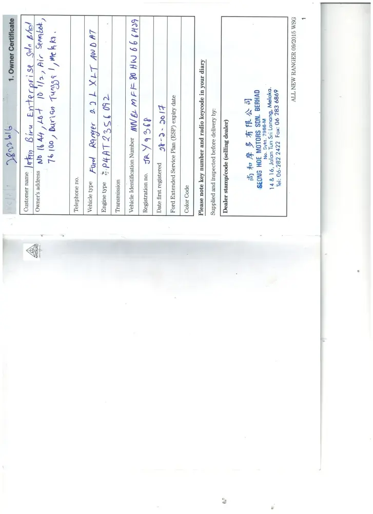 For your info I bought a new Ford Ranger 2.2XLT 4WD from Malacca, Malaysia Branch Seong Hoe Motors sdn Bhd on dated 28.2.2018 as per owner certificate. After few months' time there is a symbol of "SPANNER" at my dashboard screen.