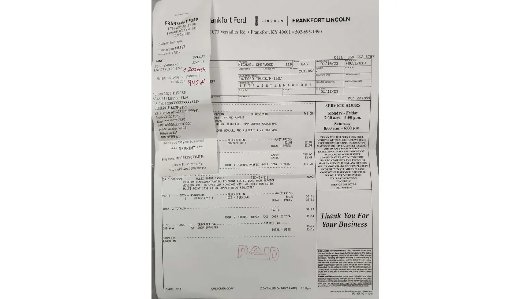 I had my truck taken to them for a blown head gasket there teke told me the EGR system needed plugged hr said he is would do it for 1500$ then calls and says the brand new turbo I had just put on from Napa was no good and he would sell me a used one for 500$ so I go to pick my truck up and the lady says sir I have no paperwork on your truck .I said it is right there I was told to come pay for it and get the keys.she said she knows nothing about it to go talk to the mechanic.he said yes it's done give me the money here are your keys I asked for my turbo and he had taken it home .I said I wanted it back it's brand new it only had 4hrs on it.he said ok he would bring it I could pick it up tomorrow.so I get my truck made it a block it locked up . So I call he sends a wrecker I go to pick my new turbo up and it wasn't the one I had bought from Napa it was so some dirty old turbo that come from AutoZone he stole my turbo any way even though this was done at the Ford dealership they in will not do anything to help fix truck this guy has had it like 5-6 times and it still does same thing it is locked up and can't drive it and he no longer works for them