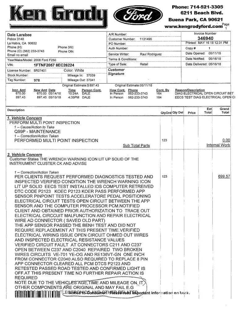 On May 11, 2018 I took my 2008 Ford F250 to Ken Grody Ford in Buena Park, CA. The reason for taking it in for service was the wrench warning icon was lit up solid. Per my request, the service department performed diagnostics to determine the problem.