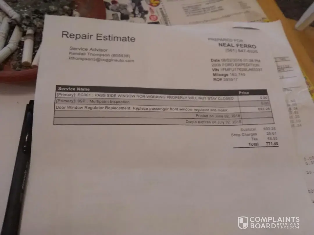 I brought my 2008 expedition into coggin ford in jacksonville to repair the drives side window, regulator and motor for 712.46$ monday5/21/2018, gamble, service advisor, calls me on tuesday 5/22/18 and informs me ford order the left hand parts, but they received the right hand side parts instead. On may 23rd, and may 24th gamble tells me the same the left side ordered but received the right, on may 25th gamble calls and said they received the correct parts and door will be fix today friday 5/25th. I go to ford on saturday may 26th pay the cashier 712.46$ for the left window repair. The truck is brought to the service area. The truck was running I open the drive door, I did not move the truck, I tested left window, it worked great, then pressed the button for the right, there was a terrible winding noise and then the right window dropped. This was witnessed by pat the servce advisor and the shuttle person. Pat tries to put the window up but falls on him. I do not move the the truck, told pat I was leaving it, he indicated that they would make it right? I returned on memorial day, may 28th, I am informed by matt, service manager, ford has a new estimate for the right door at 712.46$. I explained to matt on friday as indicated in the service report from the mechanic left window repaired, right window ok, with in one night at ford the right window does not work? According to matt these thing happen and the window motor go over night? Matt said they would not be retsponsible but they would take 20% off! On tuesday may 29th I speak to gamble again, he holds the same position as matt the service manager, "things just happen"I request to speak to the general manager. On wednesday5/30 I finally speak to richard johnson, he said the same thing, the door motors break over night on there own! He said he would investigate and get back to me! Now friday, 12 days coggin ford had my truck, mr johnson says ford is not responsible, and things happen and the right side window broke on its own! He offered 30% off the repairs, why offer anything if your not responsible!