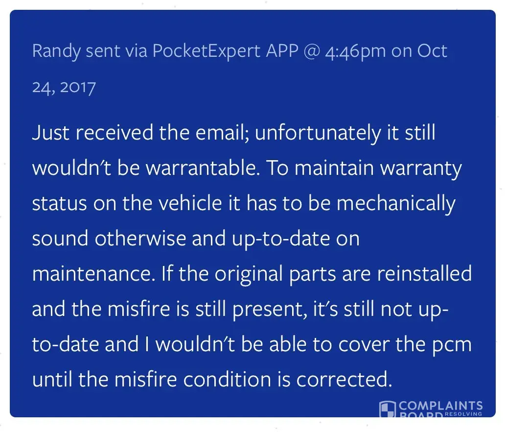 His response: "NO...to maintain the warranty it has to be mechanically sound otherwise...If the original parts are reinstalled and the misfire is still present, it's still not up to date and I wouldn't be able to cover the PCM until the misfire condition is corrected."