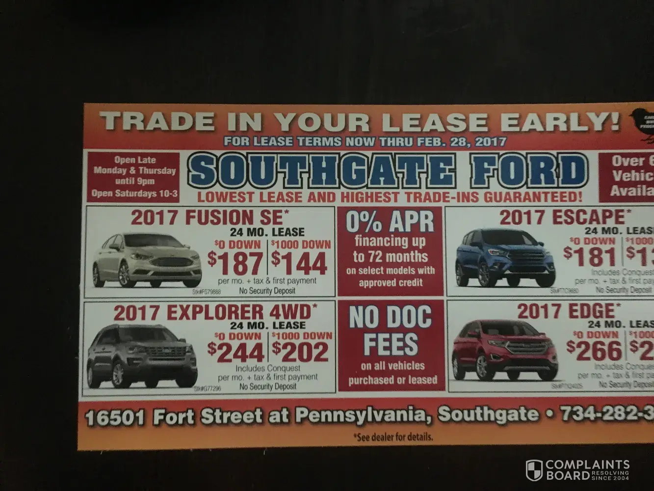 I received an advertisement from Southgate Ford there are no exclusions listed and I called and went told the I wanted said car, they went on to tell me to get my ford pin and I had already been approved. I did so they said they would have the car today. Well they don’t and they are giving me the run around. This isn’t the first time I’ve been through this with a ford dealership. There’s never anything a consumer can do but go to another auto maker which I did last time. I decided to give Ford another chance and I’m getting screwed over by Southgate for because they run ads for cars they don’t have and want to up sell me! Well I don’t want the up sell I want the car advertised.