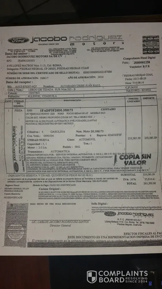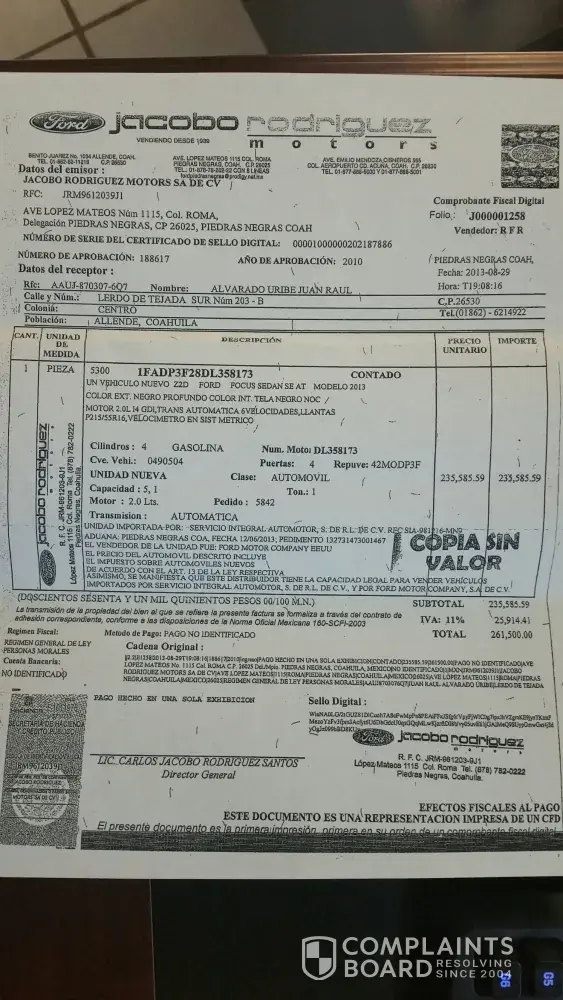 Today the vehicle is in the aforementioned distributor pending my authorization for the official diagnosis which is worth approximately $ 6, 800 MXN plus the repair price which is not yet confirmed, the last maintenance registered with Ford piedras neegras mexico was in the month of December and there is no record or indication that there was any premature problem, which gives rise to the doubt of this event.