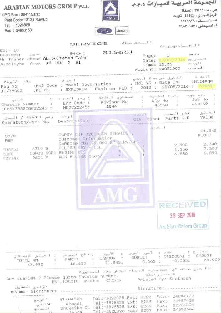 My name is Tamer Taha, I own Ford explorer model 2013 in Kuwait under agent warranty "Arabian Motors Group Co. till 2018", From day one I Maintain all the regular maintenance/services with the agent and never missed any routine service/maintenance.