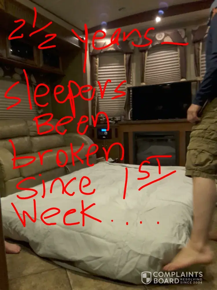 I'm really sick and tired of complaining and nothing being done. For as long as we have waited, I almost wish that they'd have looked me in the eye the very first visit and said, "hey lady, you ain't gonna get that sleeper fixed, not ever, Cuz we just ain't gonna do it for ya...get your blow up mattress out and store in in that broken piece of furniture Cuz yer gonna be needing it... and that spread in your master? Dig out that old quilt, and get used to it Cuz your bedroom ain't ever gonna look like the model you looked at"