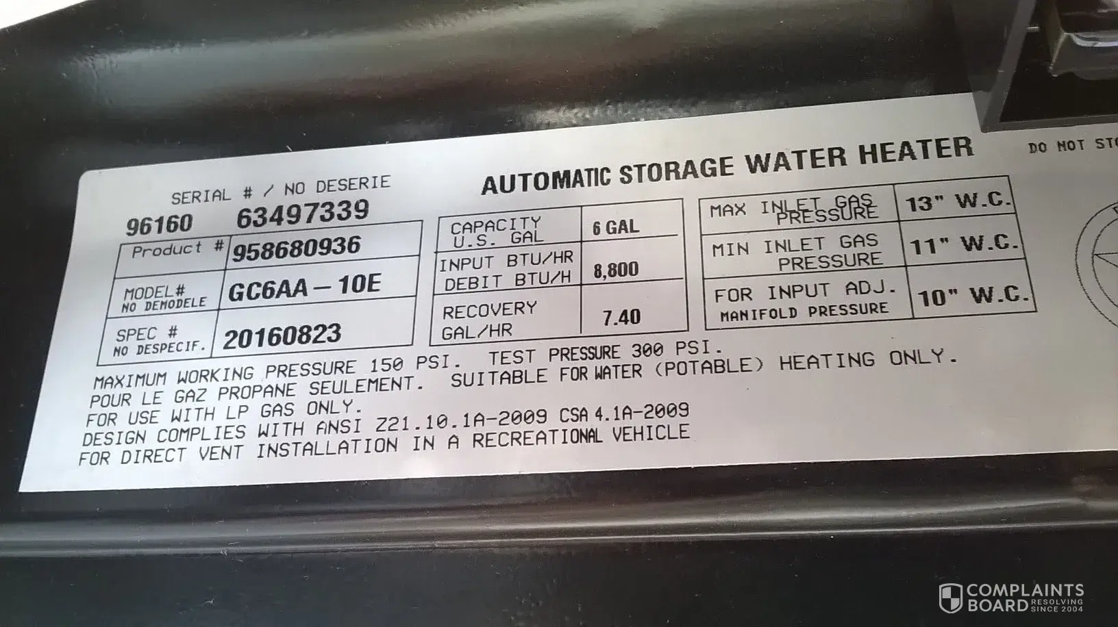 This unit was not right in the first 50 miles we have owned it and now it is 2 weeks and we are not getting reimbursed when I was told to call a mobile service company while on vacation. it was 4 days until they could get out to our unit. Meantime water was running from under or cabinets and also into the bottom storage cabinets outside. I removed the inspection door and found the fitting on the water heater was dripping.. Tried to tighten it, but had to wait for it to cool down to get a good 1/2 turn on the nut. I noticed what appeared to be black mold on the board the water heater was setting on. This was July 2nd. The the next morning while the unit was even cooler, I got another 1/4 turn on the nut as there was some moisture on it. That seemed to stop it and meantime I had removed bottom drawers and put a fan blowing under the cabinet to help dry things out after soaking up what I could. This continued into Wednesday July 5th.