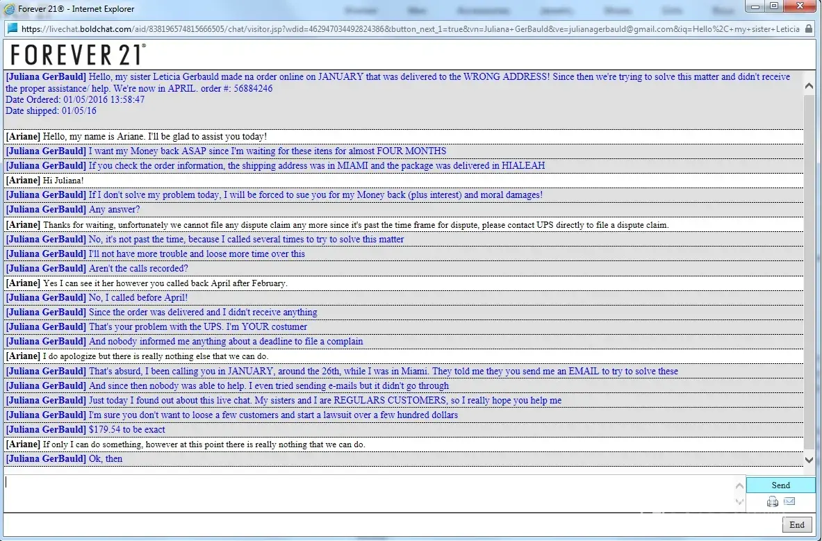I placed an order in January and it was delivered in the wrong city (Miami-Hialeah). Since then I have been trying to contact Forever21, and they always said that in 8-10 days I would have an answer and nothing happened. As I live in Brazil it is very hard for me to call, so I kept sending emails and still no answer. Then in April I decided to call again, and they said that the time to complain had already passed and there was nothing more they could do and that I had to talk to UPS. I contacted UPS and they told me that their costumer was Forever 21 and they could only answer to them, and I had to talk directly to Forever 21. As I wasn't happy with the answer, I called again the next day to Forever 21, and a woman answered me and she told me she would help me. She gave me her email so I could send the informations I had, promising an answer. I sent everything and I never heard back from her. I called again twice. Once, a man answered and I told him the name of the woman that was helping me and he told me that she wasn't there but he could help me. He told me to wait because he had to talk to UPS and they would contact me in 8-10 days. I waited, and again no one called or emailed me. Today I called again, and another woman once more told me there is absolutely nothing they can do. So I decided to complain here, because I have lost 180 dollars and my time trying to solve this since January, and the only answer they have been giving me since then is ''wait 8-10 days'' and ''there is nothing we can do''. I really want my money back or a store credit for the price I paid.