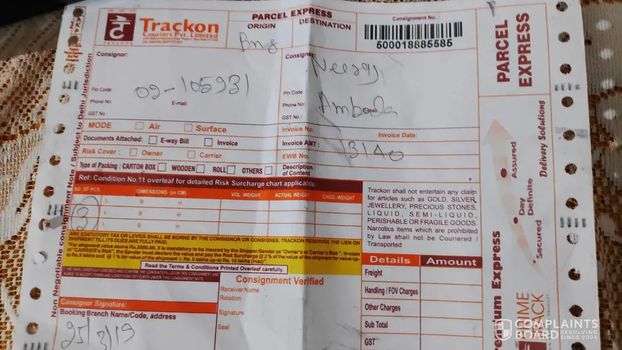 Today I have received that goods from Trackon couriers docted no. 13140. When I opened these boxes, out of them 2 bottles were broken. With this mail I have attached the pics of that broken bottles.