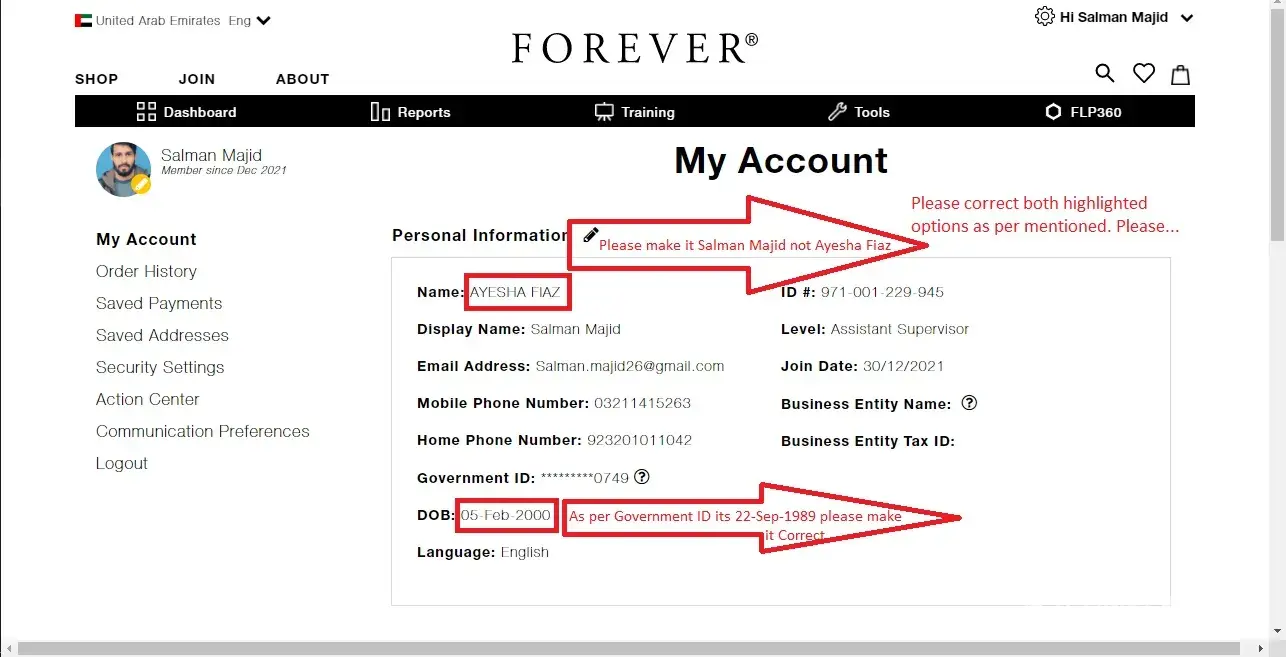 I Need to file a complaint regarding my account details update in forever living. I am a new employee here in this company. So straight to the point the issue is while creating my account with personal information. I put a bit of wrong information into the filling form. And I only want to update it. The system of your update personal information only allows to update "Display name" option not a "Name" option. I want to mention both "Display name" & "Name" option as Salman Majid only.