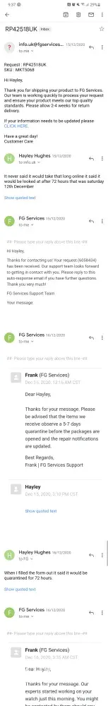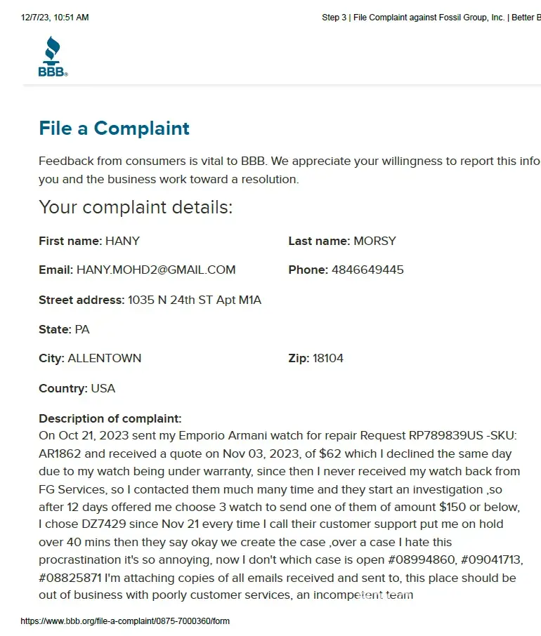 On Oct 21, 2023 sent my Emporio Armani watch for repair Request RP789839US -SKU:AR1862 and received a quote on Nov 03, 2023, of $62 which I declined the same daydue to my watch being under warranty, since then I never received my watch back fromFG Services, so I contacted them much many time and they start an investigation ,soafter 12 days offered me choose 3 watch to send one of them of amount $150 or below,I chose DZ7429 since Nov 21 every time I call their customer support put me on holdover 40 mins then they say okay we create the case ,over a case I hate thisprocrastination it's so annoying, now I don't which case is open #[protected], #[protected],#[protected] I'm attaching copies of all emails received and sent to, this place should beout of business with poorly customer services, an incompetent team