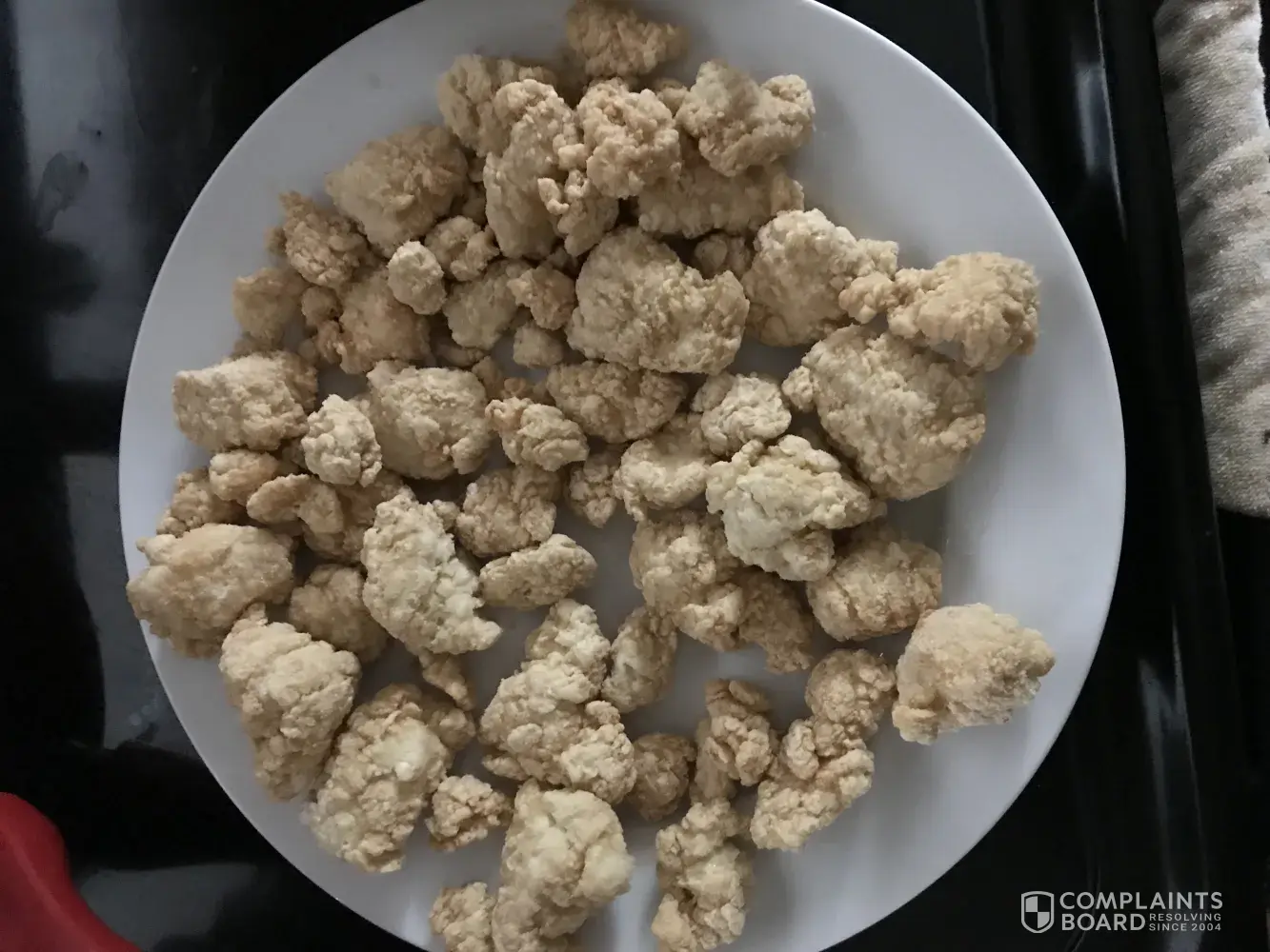 Some actual chicken nuggets and lots of "batter" nuggets. In this 1 1/2 pound bag there were actually only 20 peices of battered chicken. This for $8.99! 6 servings? Hardly. Very disappointed. Always thought of your company as trustworthy. I'll know better from now on. Did not get what I paid for.