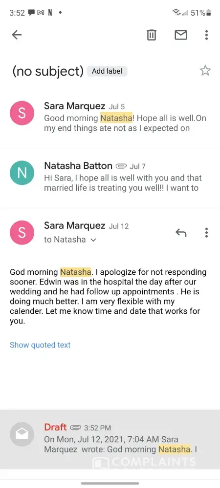 I signed a contract last year however due to the virus we postponed our wedding for June 19, 2021. Our Sales Manger was Natasha Batton. Before I proceed with my complaint I want to let you know of the steps taken prior to filing this complaint. On the morning of June 20, 2021 I was eating breakfast and a young lady from the front desk approached us (my...
