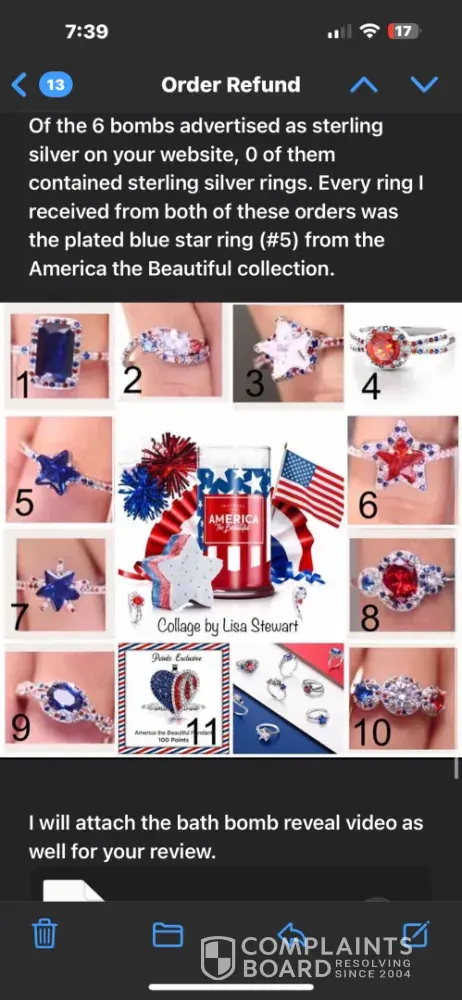 This company advertised 925 Sterling bath bomb and sent me plated rings inside of them instead. They are refusing to refund because the bombs arrived intact. Regardless of whether the rings inside were wrong. I’m looking into finding a lawyer. They’ve been paid and switching people for years and just counting on people not to complain. It’s time to complain.