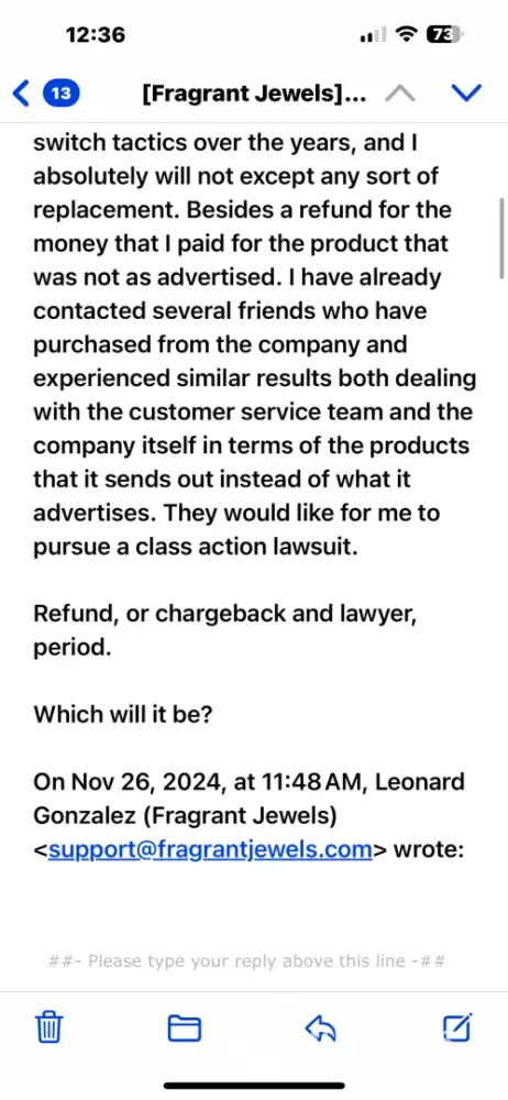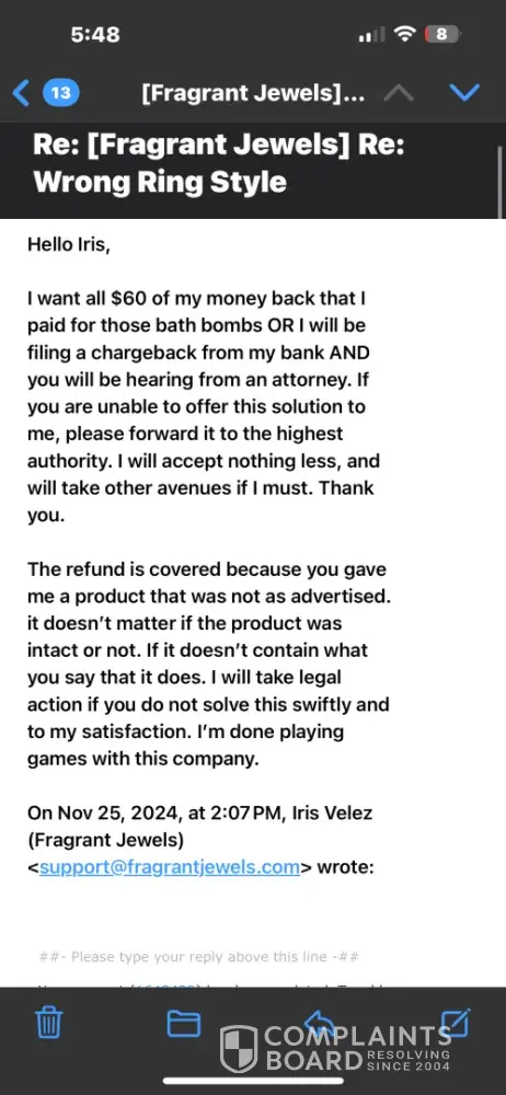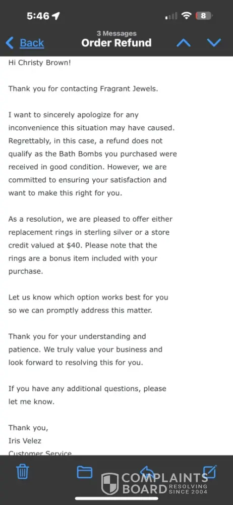 Fragrant Jewels is unethical. They are refusing a refund of *** due to their negligence,lack of morals and blatant disregard of their customers. Fragrant Jewels is unethical. They are refusing a refund of *** due to their negligence,lack of morals and blatant disregard of their customers.I placed an order in August, they sent the wrong the wrong candle/bath bomb. I emailed several times and no replies. Finally last week a customer rep responded and I had received the correct ifem, 2 months later. No mention of the refund due to their negligence, lack of integrity and blatant disrespect of customers. I was offered 200 points for my "inconvenience" and " time" to get this resolved. I do not find that acceptable because I know ever single company has the ability to issue a refund, the just don't wantvto. So now I'm asking for a full and immediate refund from Fragrance Jewels in the amount of *** Thank you.