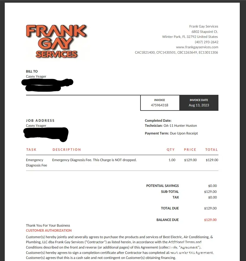 This company (frank gay services plumbing, electrical, air conditioning services in orlando florida) is a scam, ripoff, dirty business practices... With a capital srdp. They have a high employee turn over and management is a mess. They will come out to your home. Tell you a 2 hour job is 4 hours. They then take the first hour to walk around and ask you what you want and if this and that is ok. If we new what the hell we were doing we wouldnt have called them. So they waste the first hour doing that. Then there never prepared. So they have to walk back and forth to there trucks to keep getting supplies. That waste another hour as it happens very often as they're eating and drinking and smoking on your money. They finally get to the job which only take an hour. Than they waste the final hour with clean up. Back and forth to the truck. They sit in there vehicle for 15-20 minutes preparing an invoice. Then when you get the invoice they will charge you for an 8 hour job and look at you as if its ok after they just told you it was a 4 hour job because the had 2 guys. I use to work for this company so I know first hand that they're a scam. The only reason they have alot of good google reviews is because the pay for birdseye.com a management repuation repair company. They filter out all the negative reviews and only kep the good ones. If you google search them you will see what I mean about birdseye.