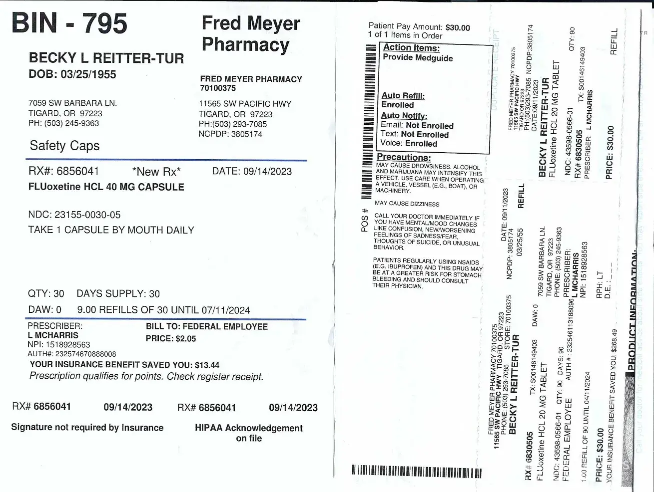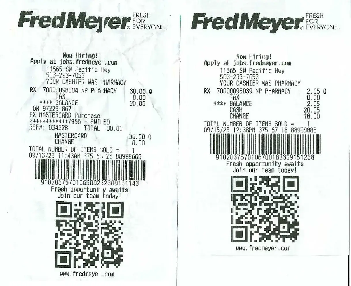 Last August I needed to transfer an Rx to a Minnesota Walgreen's on a 1-time basis. I had recently had the dosage at the FM pharmacy increased & there was no problem at Walgreen's with that transver. However the next month I returned to Fred Meyer for a refill. I thought it was strange that the cost was $30 something instead of the $2 something I paid...