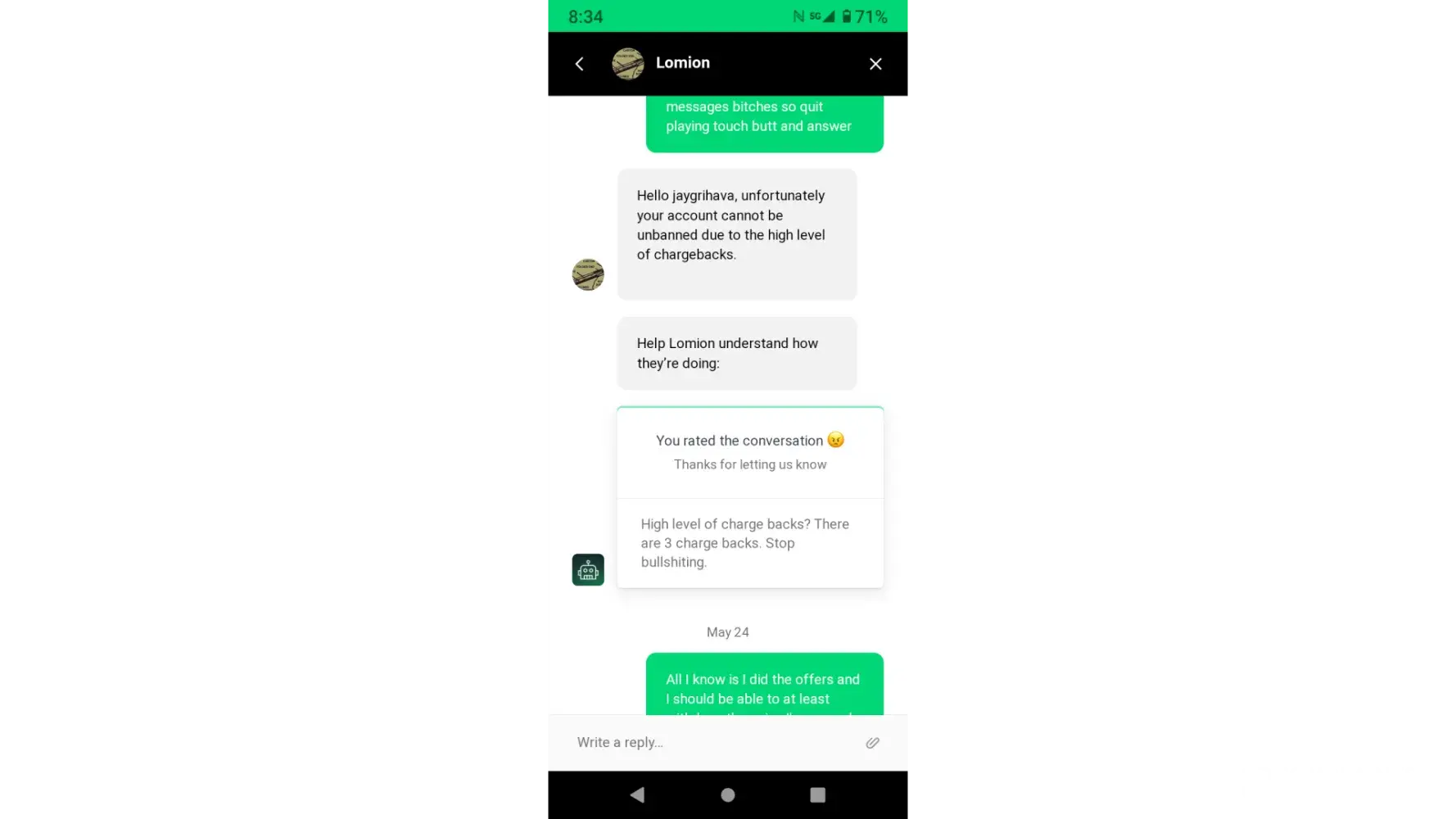 They banned my account on Saturday and I have sent them numerous messages to review the decision.