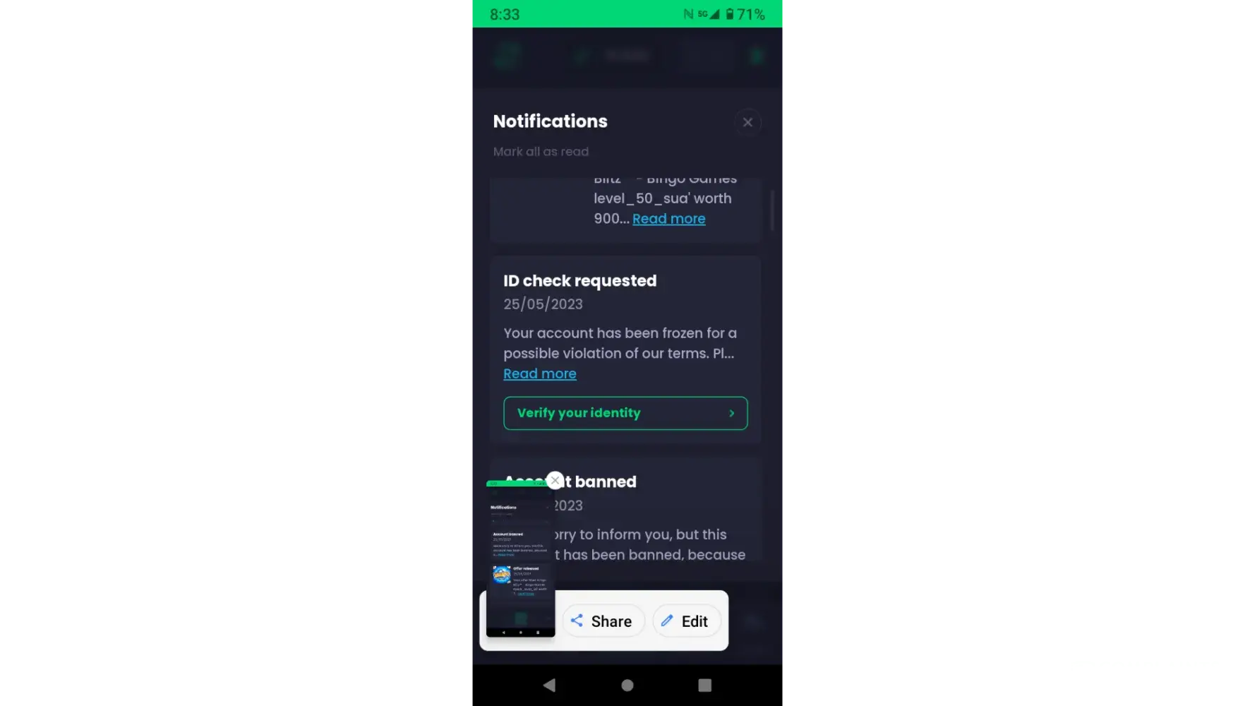 I saw the notification that my account has been baned because there system picked up that I have multiple accounts which is not possible.