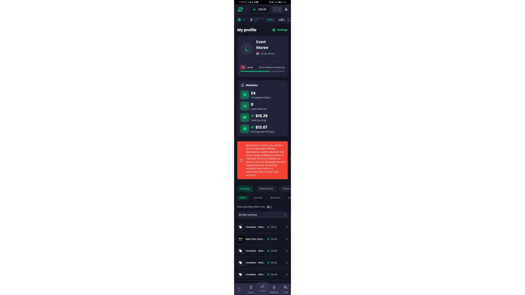 Yesterday I spent money on Uber eats to get to $10 so that I can withdraw I have a Timewall account linked to Freecash which is permitted.