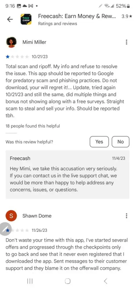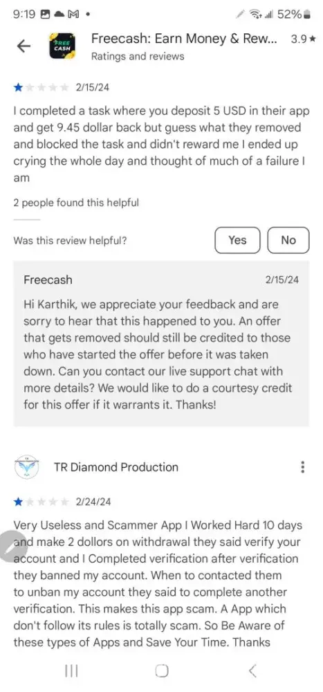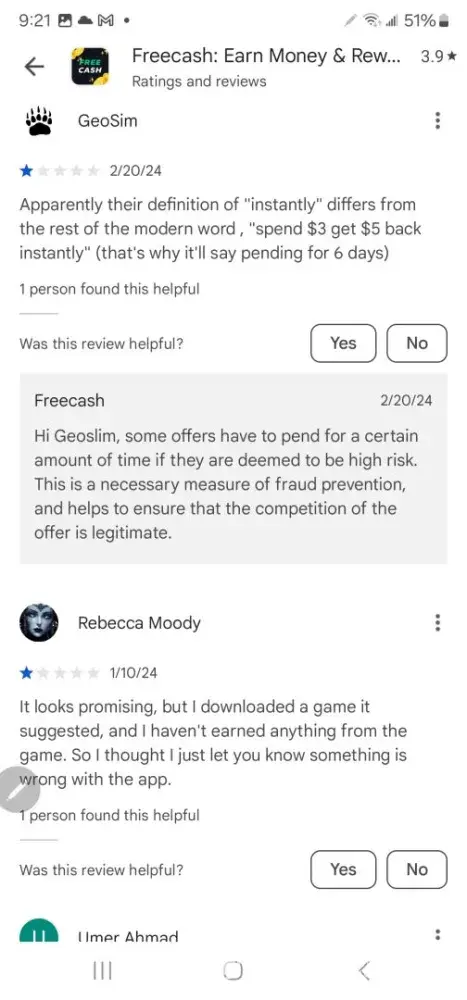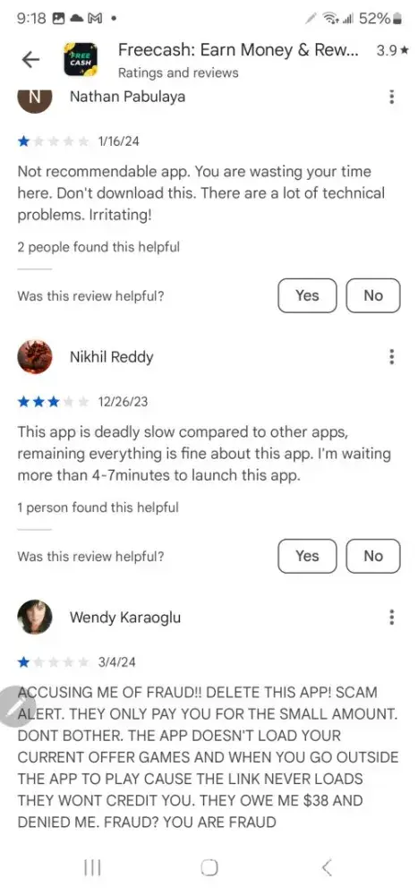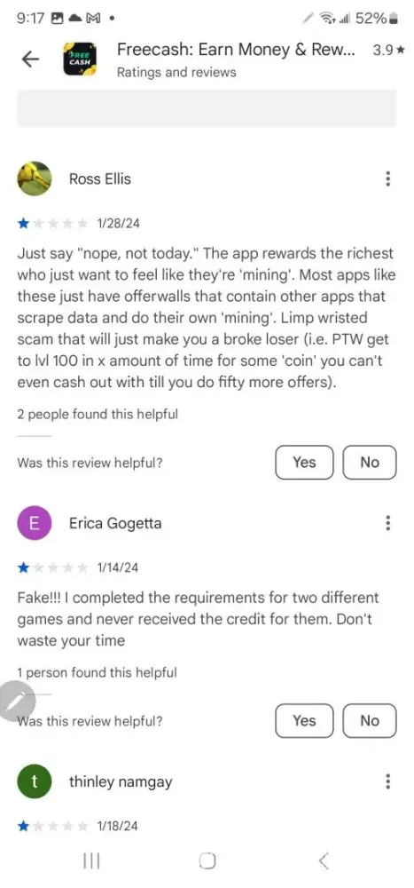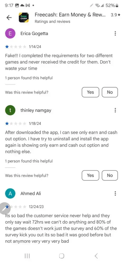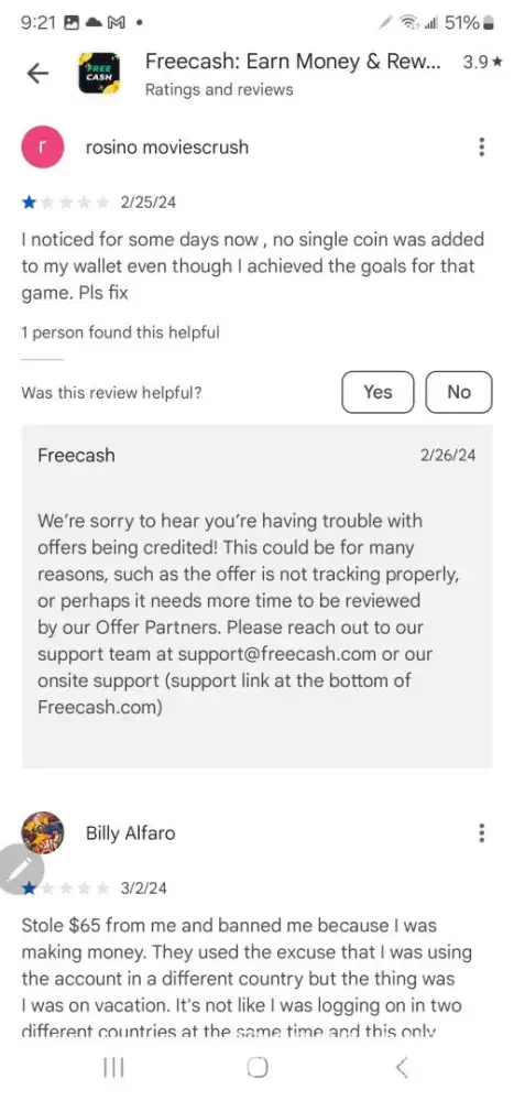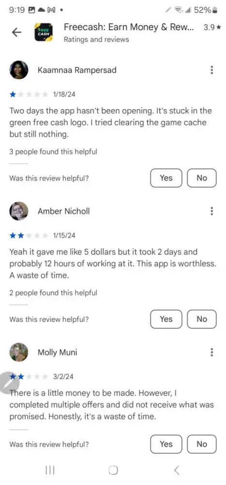 Free Cash earns a 1.9-star rating from 9 reviews and 31 complaints, showing that the majority of users are dissatisfied with rewards and earning opportunities.