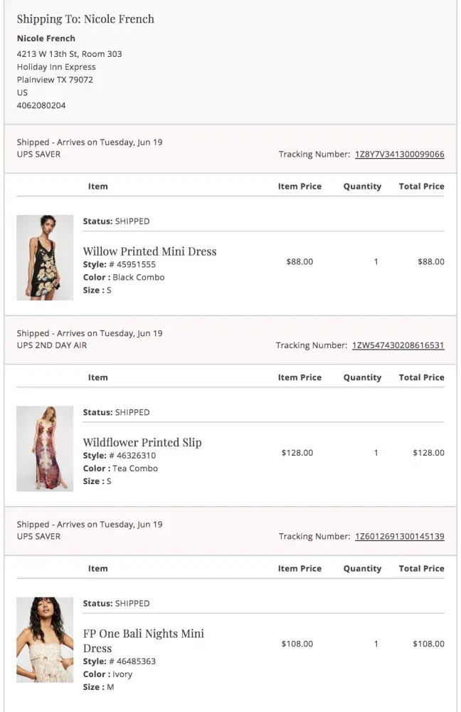 I ordered 3 dresses 6-15-18, next day air. I was informed that it would arrive 6-19-18, but was heading to the wrong address- an address that hasn't been on my account for almost 5 years. Immediately after receiving the shipping confirmation email, I called FP to see if it could be stopped. They told me we could submit a reroute request but I would have to do that separately for each item, even though they were ordered together! So I had to wait for each email, call customer service and request a re-route. None of them were successful and the items were returned to sender. I called over and over and over asking where my items were. I was first assured they would arrive any day, then told that there was no order for them, then told that one of the items wasn't in stock the day I ordered it, so it wouldn't be arriving. Um, really. The item was shipped out! It obviously was in stock. 7-3-18, I shockingly received one of the dresses. I called to see where the others were. The customer service rep had no record that the dress I received had ever even been sent. I hoped that the other two dresses would also arrive, but they didn't. She told me she created a new order and would have them sent ASAP- at that time, they were both in stock. Yesterday, I sent another email- received no response. I've sent numerous emails, only one of which has received a response. Today, 7-14-18, I called yet again and was finally refunded my money on the dress that was "out of stock" and was told the other remaining dress would arrive 4 days from now. I actually wanted the dresses so I'm really unhappy about this "resolution". FP's customer service via FB Messenger told me today that the dress I've already received is in the process of being returned to them and once it was received, they would send it to me immediately. Keep in mind, I ordered this dress a month ago and received it a week ago. They have no clue.