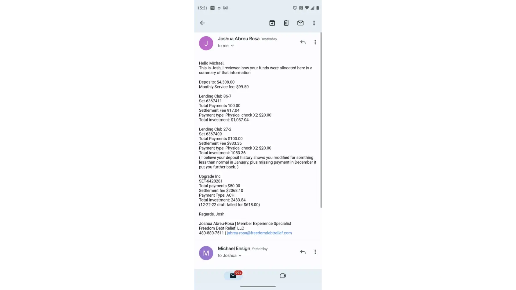 this was my email when I terminated agreement ------ Please cancel my agreement with Freedom Debt Relief. I am very upset the Freedom has not really done anything to "Relieve my Debt"; however your company has in fact made it worse. I have contacted my creditors and my fees have grown and to make matters worse they haven't ever been contacted. When I signed up for Freedom Debt Relief's helping, your representative SOLD me an idea that your company could help, yet I have made 14 payments of $389 every 15th of the month; equaling a total of $5, 446 and all I have to show is one settlement on 9/10/2010 for $634 and a balance in my trust account of about $1700. Where is the rest of the money, $3, 000 and change to be exact!