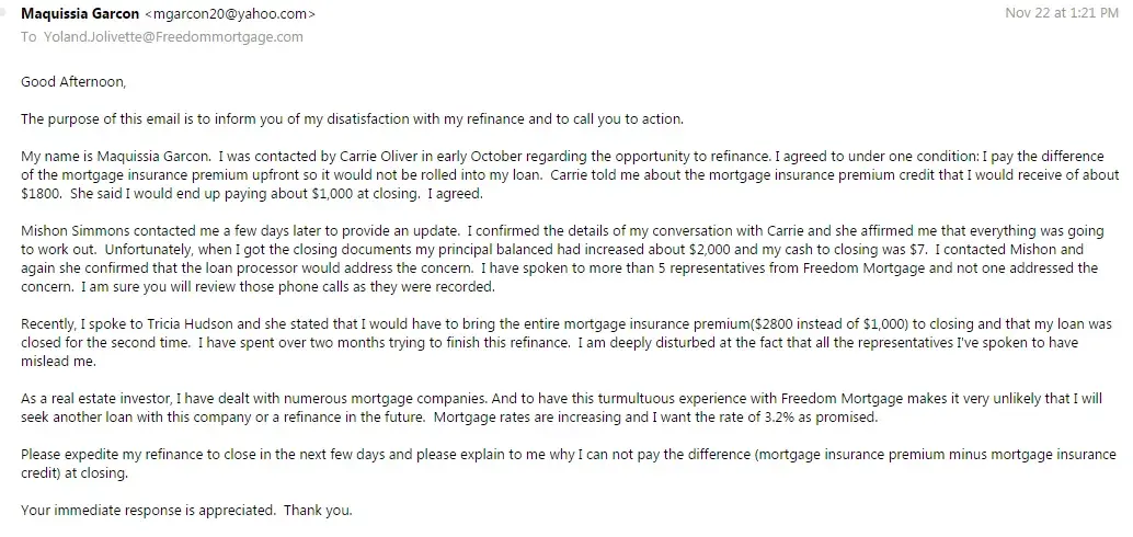 Two weeks ago I emailed Yoland Jolivette. We spoke about the issue over the phone and she said she would investigate and contact me in 10 minutes. It's been 1 week since she has communicated with me. I have sent 3 emails and no reply. I called the new Loan Officer Edward DeWald two weeks ago and left a message. Still no replies. Each time I speak to someone I have to start all over. The customer service I have received from employees at Freedom Mortgage is repulsive.