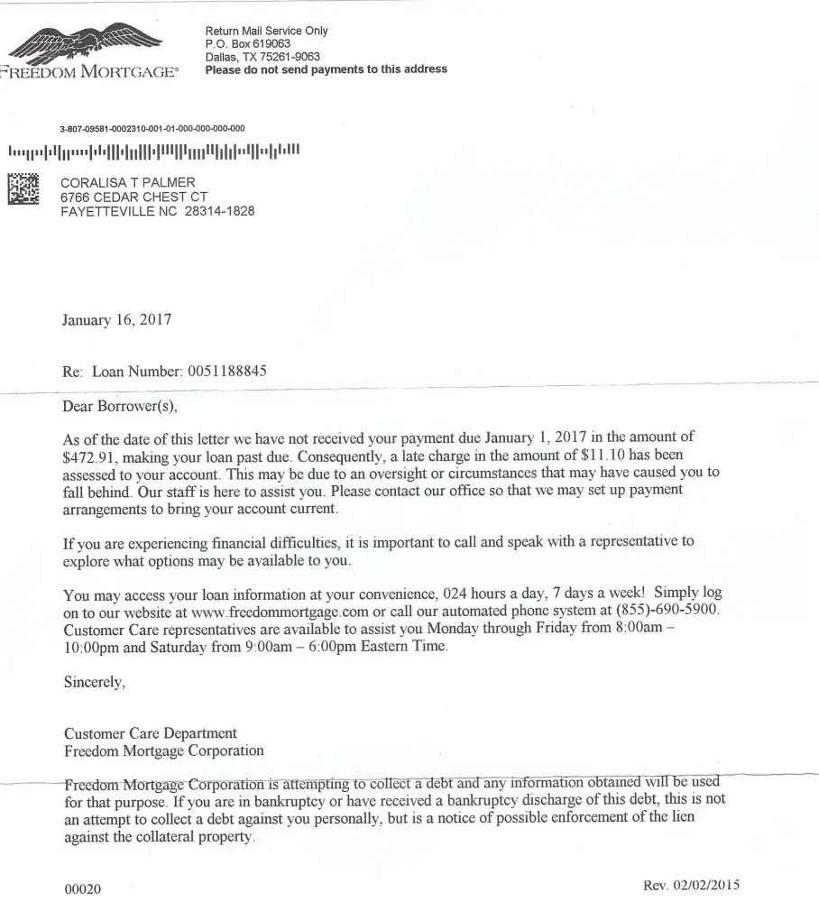 For weeks -- weeks - we called over and over. At first, they assured us the payment had been overnighted. How do you get that wrong? Freedom Mortgage assured us that the payment had been sent to the correct address and that another letter was sent to our home telling us we were in fact going to be covered. The letter was at our request.