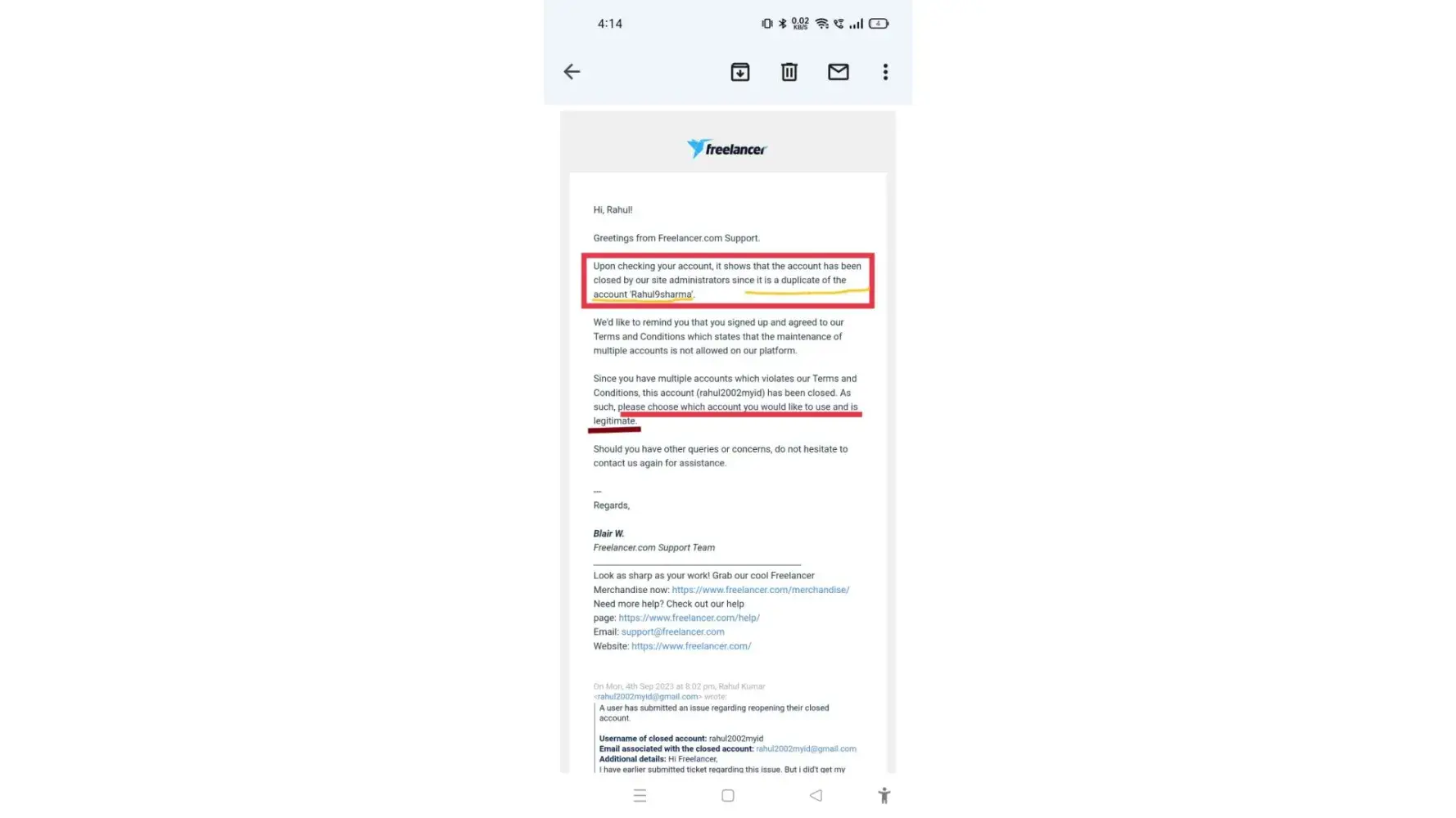 Dear manager, I have discovered a major vulnerability that will affect the platform. First of all, please be patient and read my statement. I think this contains major vulnerabilities in technology and operational convenience. I accepted a job and the client asked me to help him with cryptocurrency. After I completed the first project, he repeatedly asked me to help him, so the job was divided into three projects (because each After each completion, he marked the project as finished and could not initiate the milestone again). When I completed the work, we conducted a friendly mutual evaluation. However a few hours later I received a payment complaint from him and then my withdrawal was blocked. When I logged in to my account to check, the system asked me to upload authentication information. I did as required, and then I received the frozen money and it was returned to the customer's account. I asked for your help as soon as possible, but I couldn't use the 24-hour online service. customer service, so I sent a help email. But a few hours later, my account was closed. I don't know what mistake I made. Key point: In the case where the project is completed and the customer initiates a payment complaint, I think the freelancer and client accounts should first be frozen pending negotiation. Instead of treating freelancers roughly, you didn't give me a chance to refute, and the system automatically refunded the customer's money. The second point is that when I was asking for help, because my account was closed and I could not use the online customer, I could only send an email to ask for help. During this time, the customer may have withdrawn cash. I know that customers are very important for a platform, but I think freelancers and customers complement each other. Excellent freelancers can attract customers to come to the platform repeatedly, and more customers can attract more customers. What an excellent professional, both are indispensable. I kept screenshots of all the chats, and the communication was entirely on the platform. I hope to get a good result.