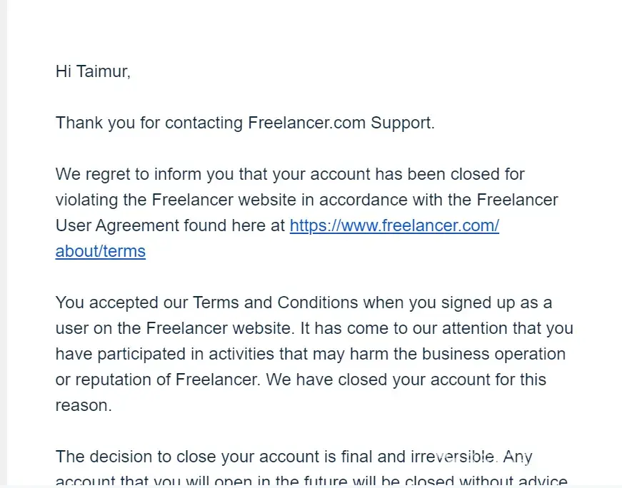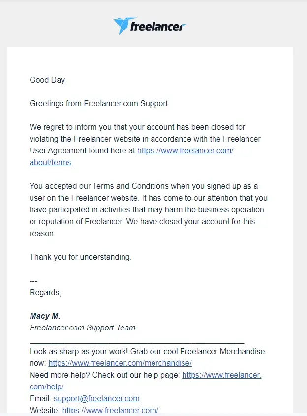 They say that you receive 50 bids monthly on a free basis, but I had only 6, was waiting the timer to get 1 bid back. Received a proposal from a person who said that she is from the Membership team and bang, next day I'm banned. Why? I don't know, there is an answer from the support team in the attachment.