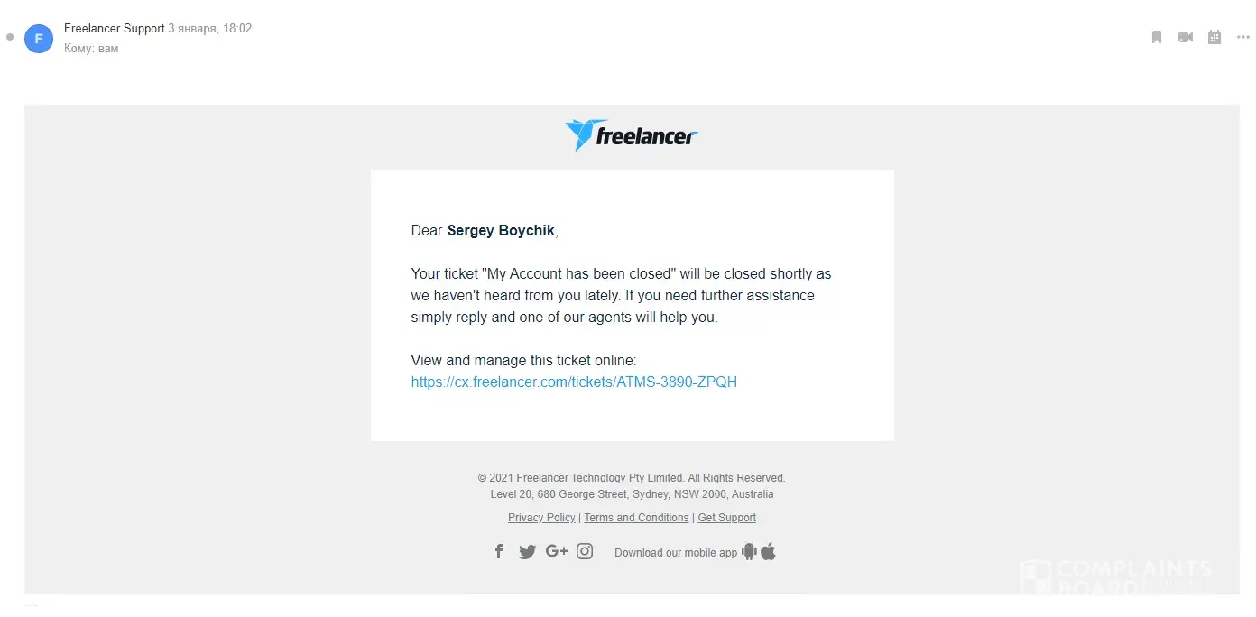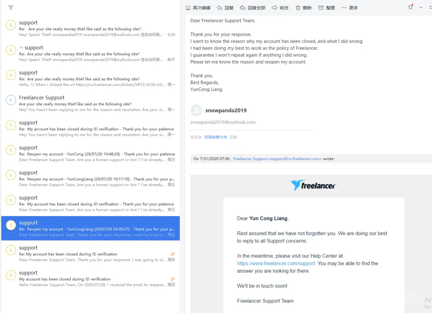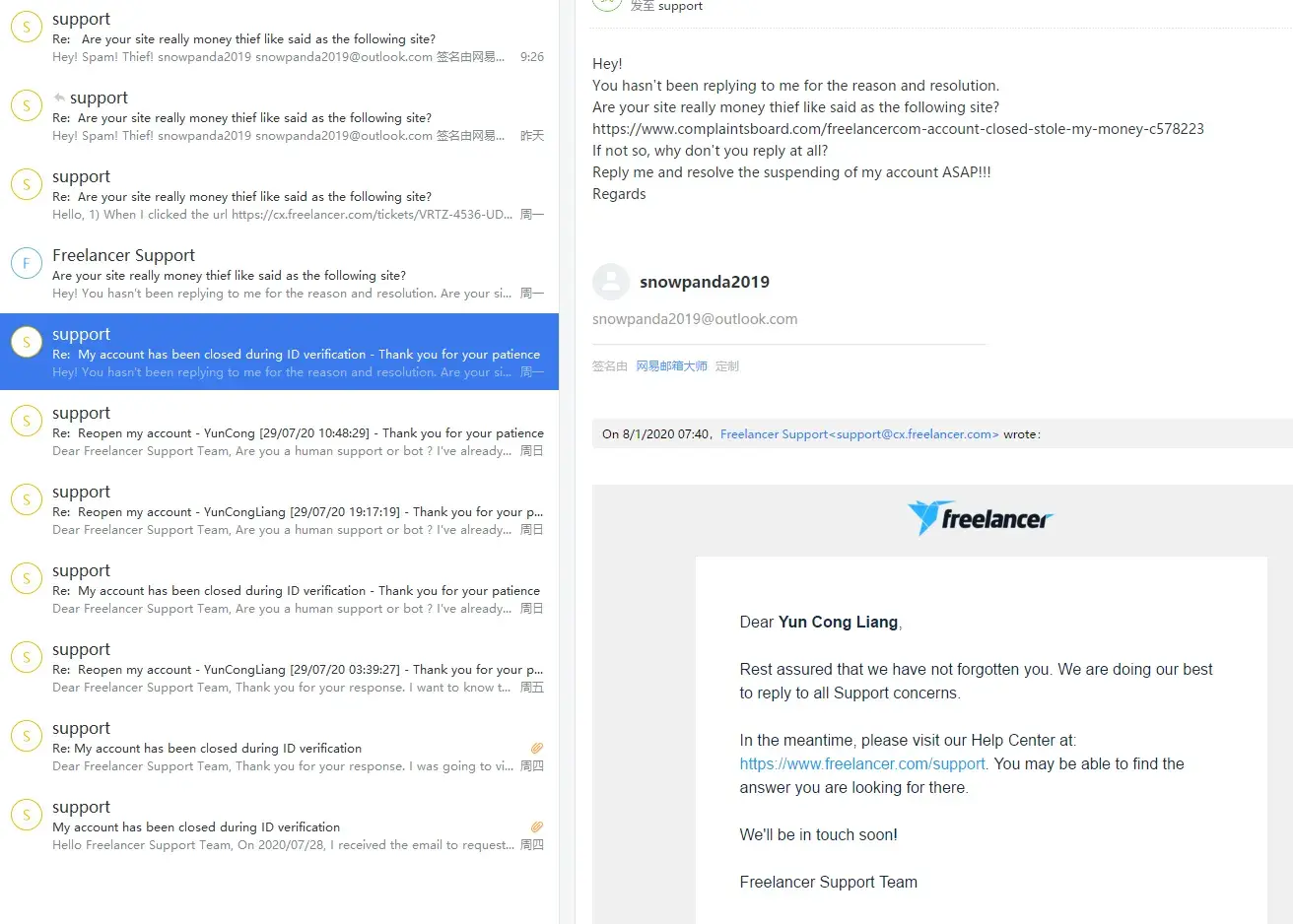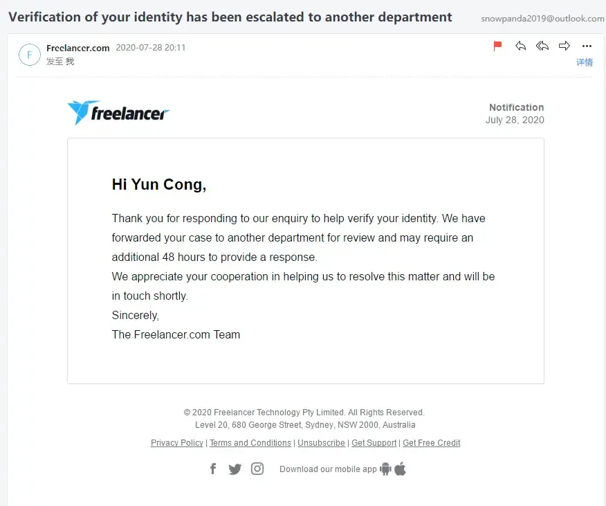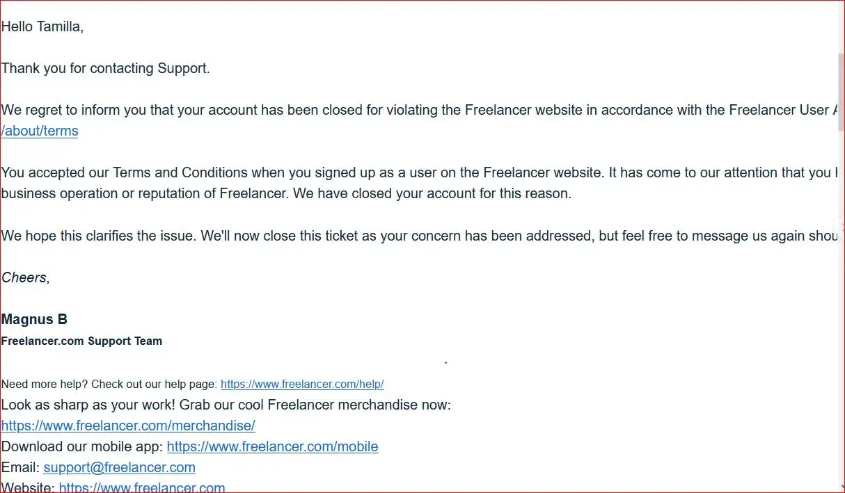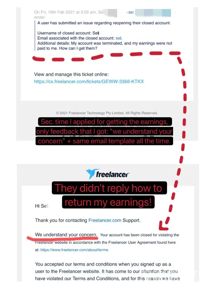 In the evening, I continued to email them [protected]@freelancer.com and submitted my complaint on the website. I continued to email their support to recover my funds, only to receive their typical automated reply: We understand your concerns + email template.