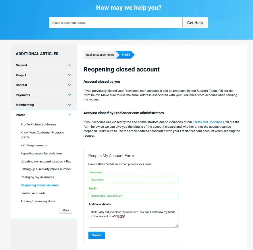 On 9 September I got from Freelancer notification that I have to verify my identity. I did it, and on 10 September evening I got an email "Further information required to verify your identity. Thank you for your submission and responding to our enquiry but we need you to provide further information to help us verify your identity.Please respond within 45 days. If we don't hear from you within this time, we'll have to completely limit your account". I didn't have time to fill out the form that day and thought that I could do it on the next day. On September 11, 2020 early morning I found out that my account is closed. The point is that I didn't receive any notifications about it. I filled out the form "Reopening closed account" a few times but I didn't receive any emails/ feedbacks to my mailbox. At this moment I want to know what is the reason to close my account and how I can withdraw my funds in amount of ~5, 5 USD!