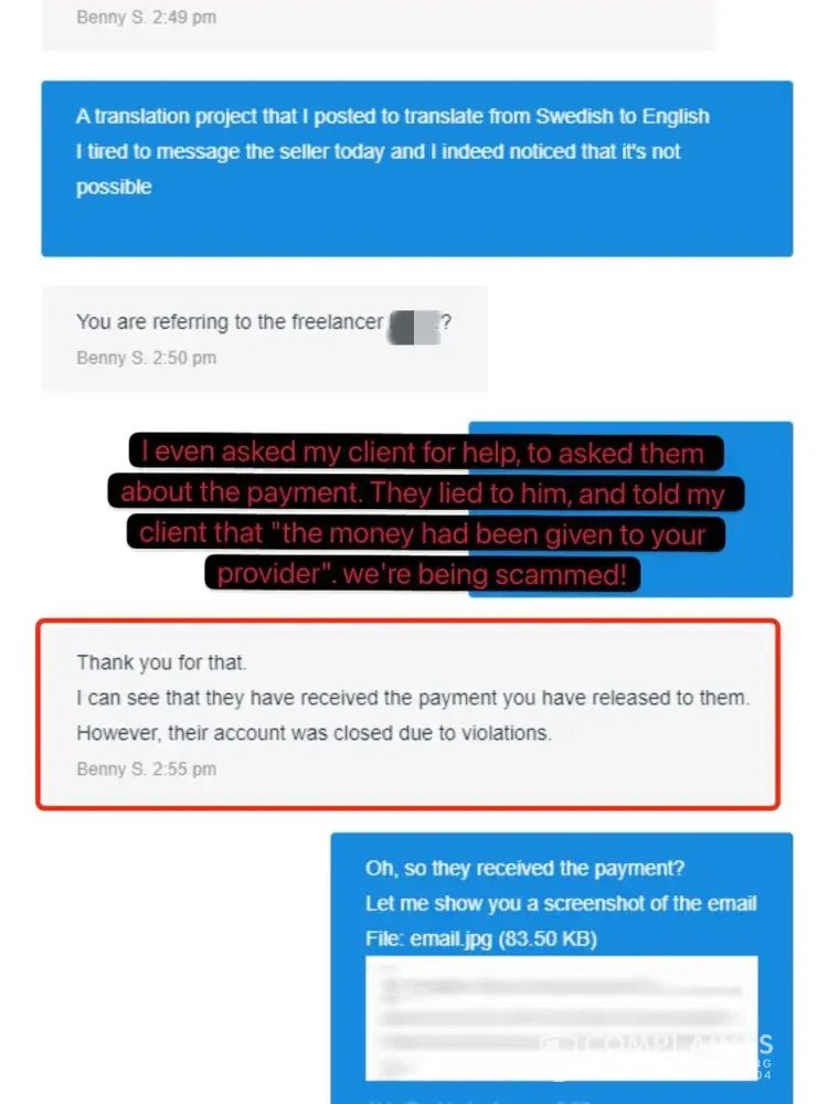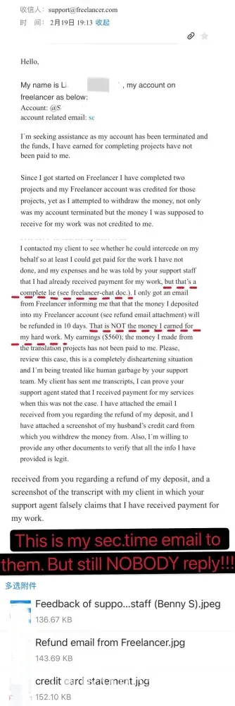 Then I asked my client to help me communicate with them, but their customer service lied to my client: saying that the money I earned was actually given to me before closing the account. (This is horrible... Freelancer actually kept the money! Yet their support team blatantly fabricated that the money had been paid to me upon termination)