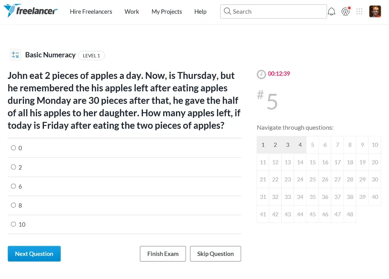 I took their basic numeracy skills test so I could add something else to my profile to show to prospective clients. Their tests - or at least the ones I looked at - cost $5.00 plus a processing fee of around $0.42. Here's an actual question exactly as it appeared on the test I took: "John eat 2 pieces of apples a day. Now, is Thursday, but he remembered the his apples left after eating apples during Monday are 30 pieces after that, he gave the half of all his apples to her daughter. How many apples left, if today is Friday after eating the two pieces of apples?" At least three other questions on the test had issues, such as multiple correct answers or no correct answer. Needless to say, this is completely unprofessional, especially considering these are paid tests. How can I showcase my skills to prospective clients with a test like this? After the test was completed, there was an option to add more questions to the test. It looks like they don't even verify new questions for accuracy. I contacted customer support and 4 days later I was told they do not refund the exam fees. Instead, they offered to let me take another exam for free and they offered me one free month of the lowest paid membership option. First, there's no way I'm ever taking another exam for that site, free or not. Second, because of the exam that I did take I was already eligible for one free month of a higher-level paid membership, so offering me the lowest one is completely pointless. Based on this experience and the countless other reviews I've read about this site, I just decided to cut my losses and run. I advise you all to avoid this shady site.